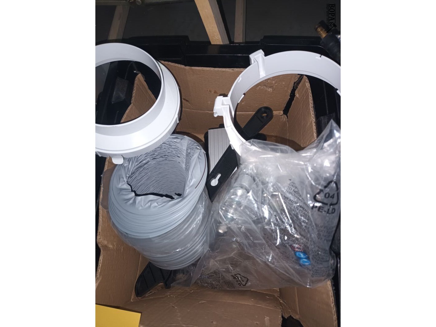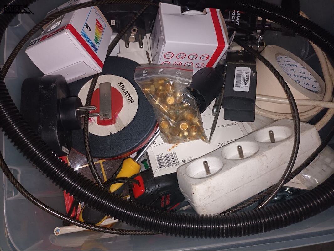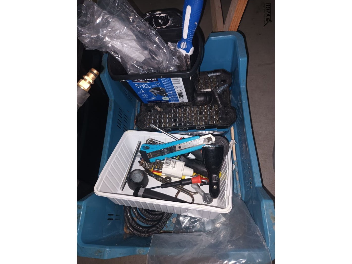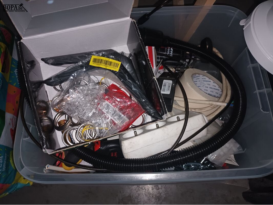 Lot werkmateriaal zoals pvc koppelstukken, drukslang, plakband, lampen, handgereedschap, 1 zak met zeilen.