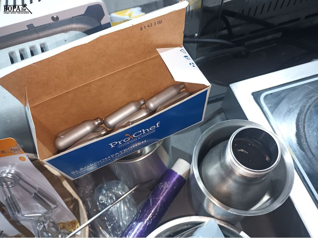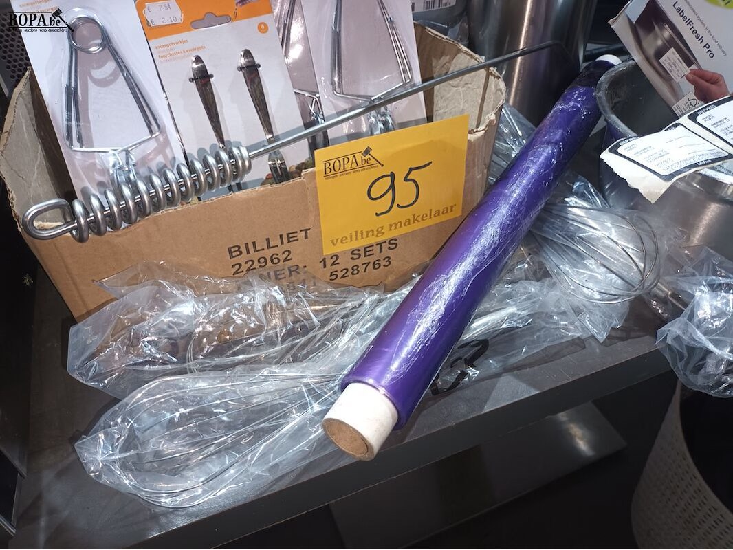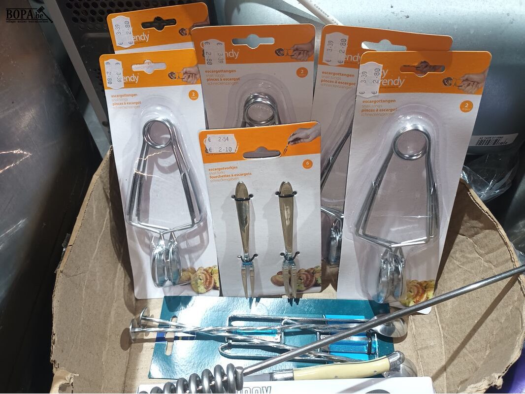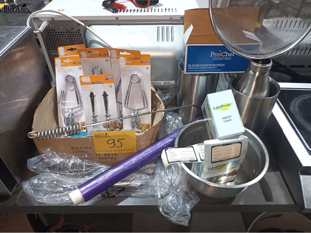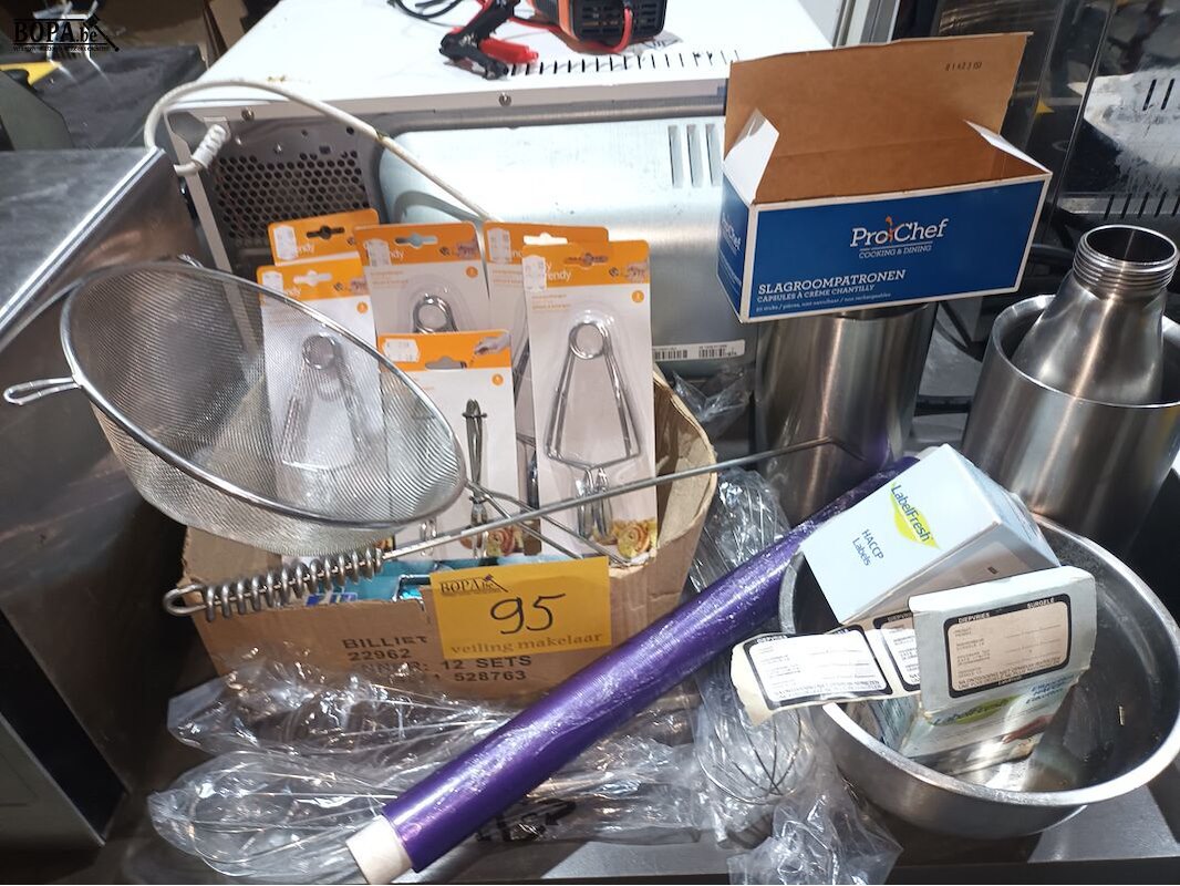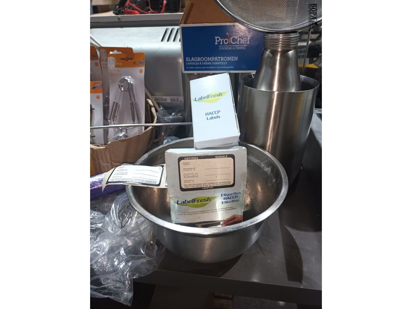 Lot keukengerei zoals gardes, mengkom, zeef, slagroompatronen, tangen en vorken voor escargots, Haccp labels, etc.
