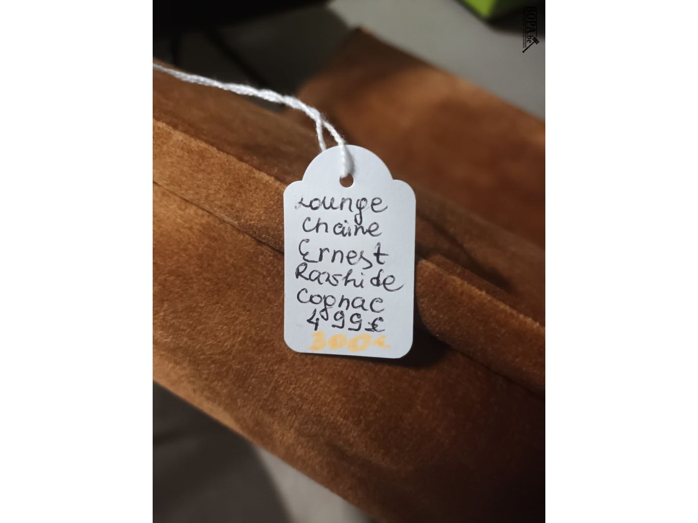 Fauteuil met cognac kleurige stoffen zitting en met metalen onderstel. 84 x 70 x 83 cm.