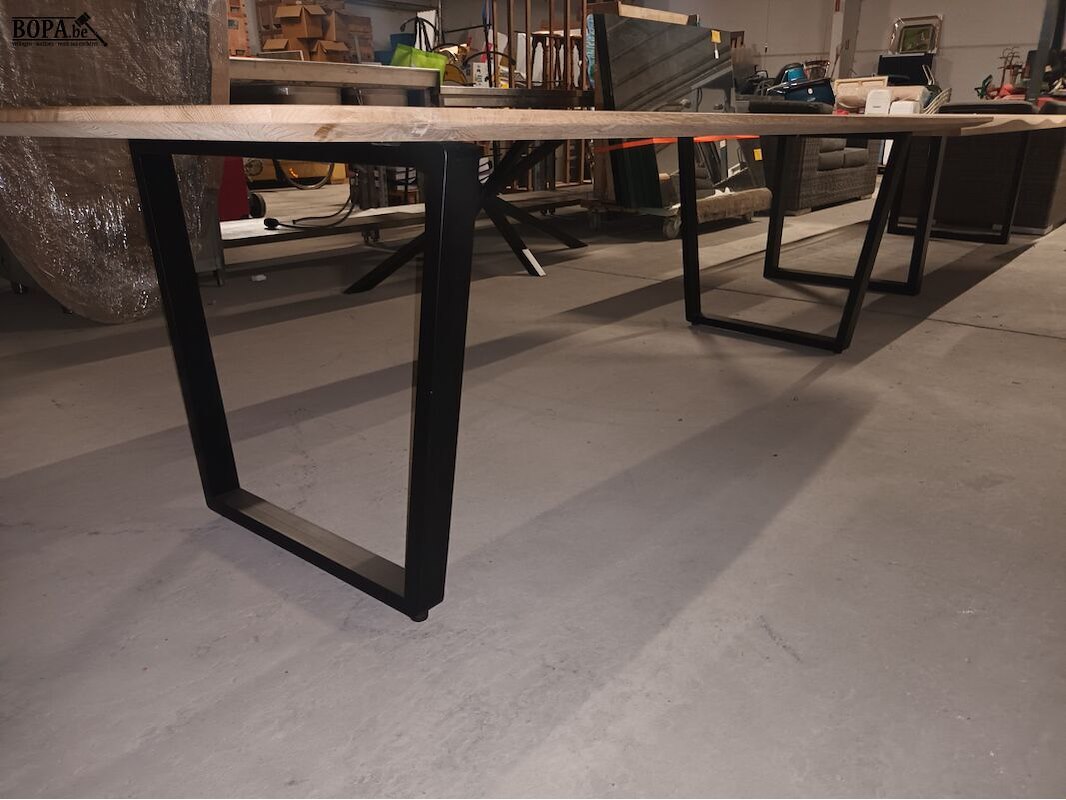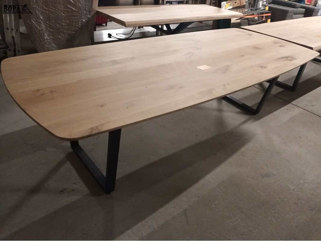 Vergader tafel met houten afgerond blad en metalen poten. 280 x 120 x 75 cm.