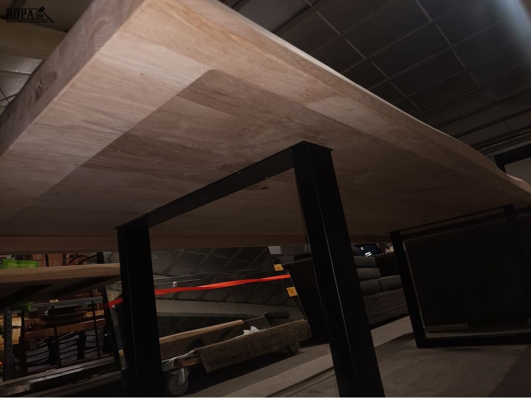 Eetkamer tafel met houten blad en metalen poten. 280 x 100 x 74 cm.