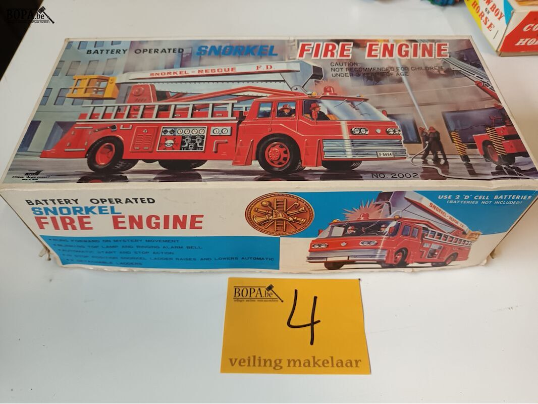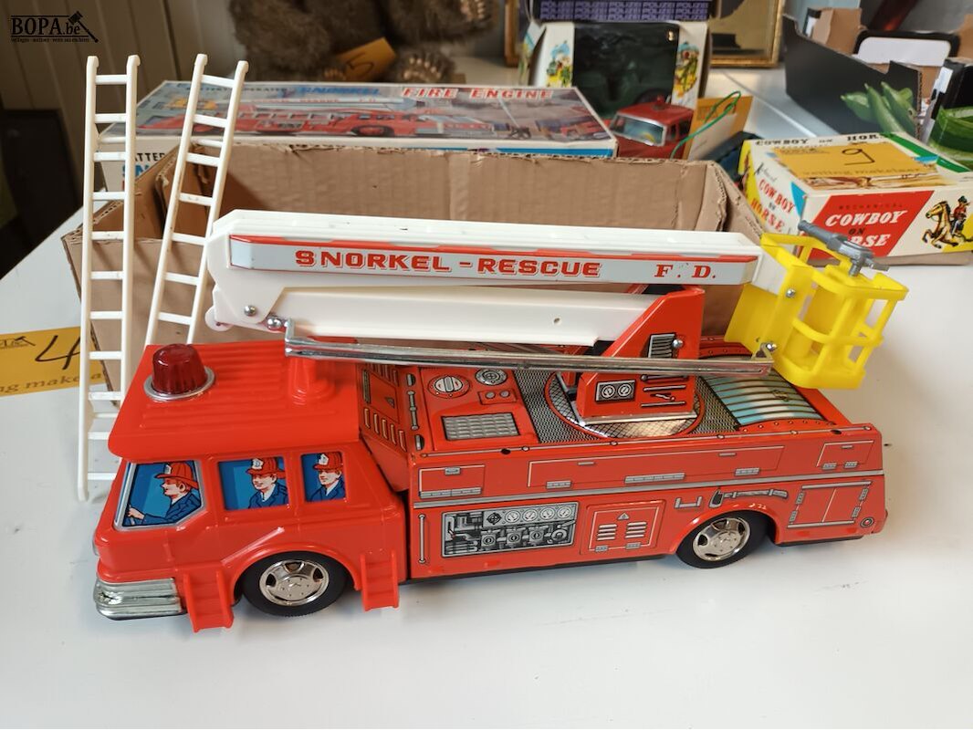 Blikken brandweerwagen, 1960. Snorkel rescue fire truck. Junior product Japan.