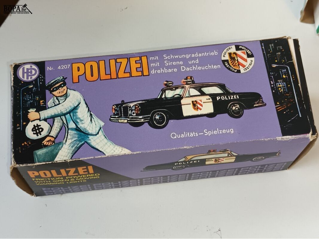 Vintage Polizei auto en jeep Jimson Hong Kong. De jeep is van plastiek met een klikkende machinepistool.