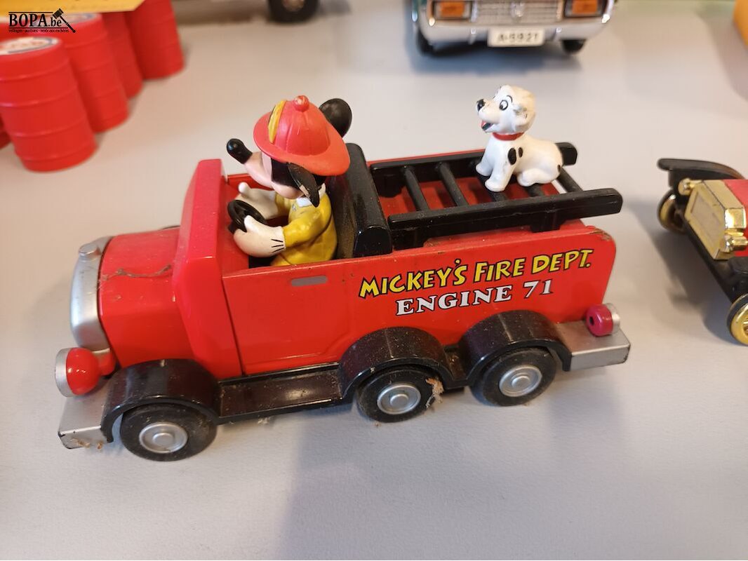 Vintage brandweerwagen en oldtimer Disney. Made in China.