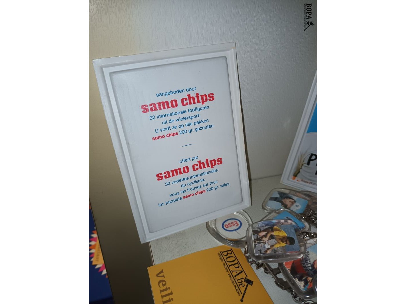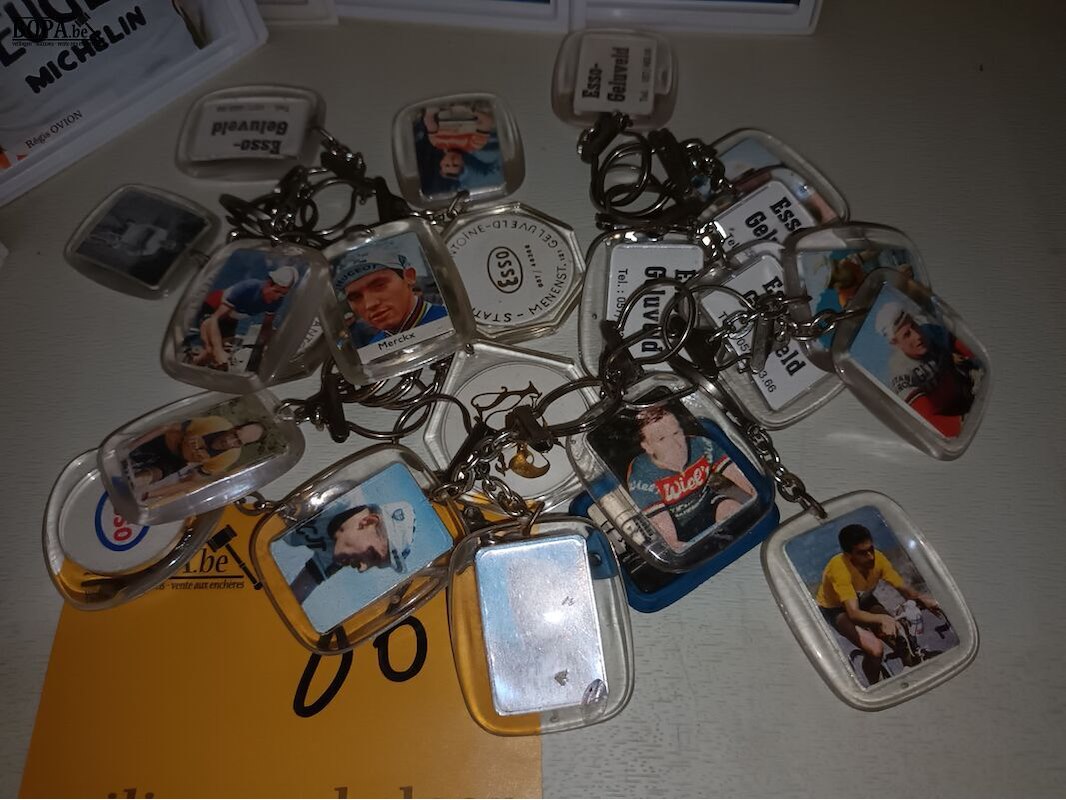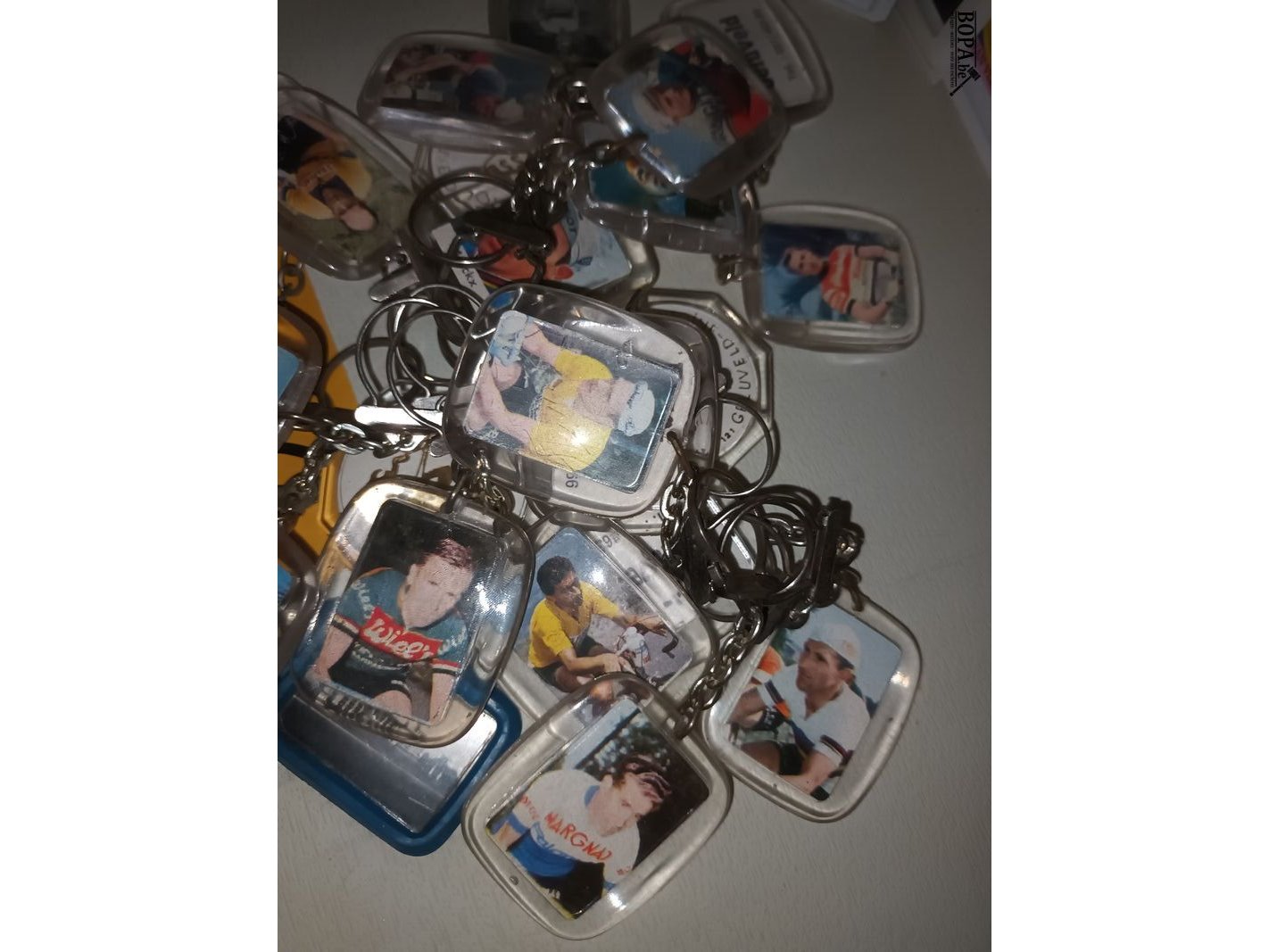 Esso sleutelhangers met wielrenners uit de jaren 60 en 70 en plaatjes uit Samo chips met wielrenners. 26 stuks.