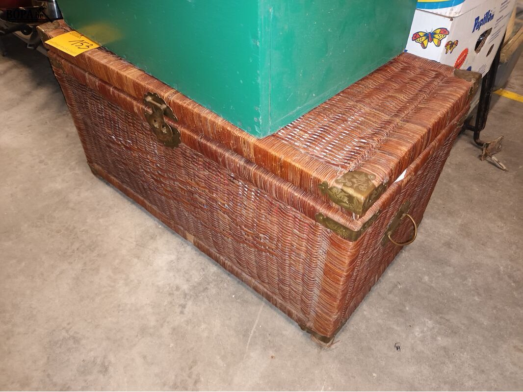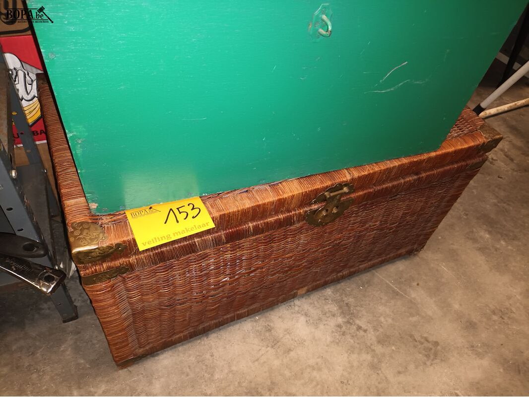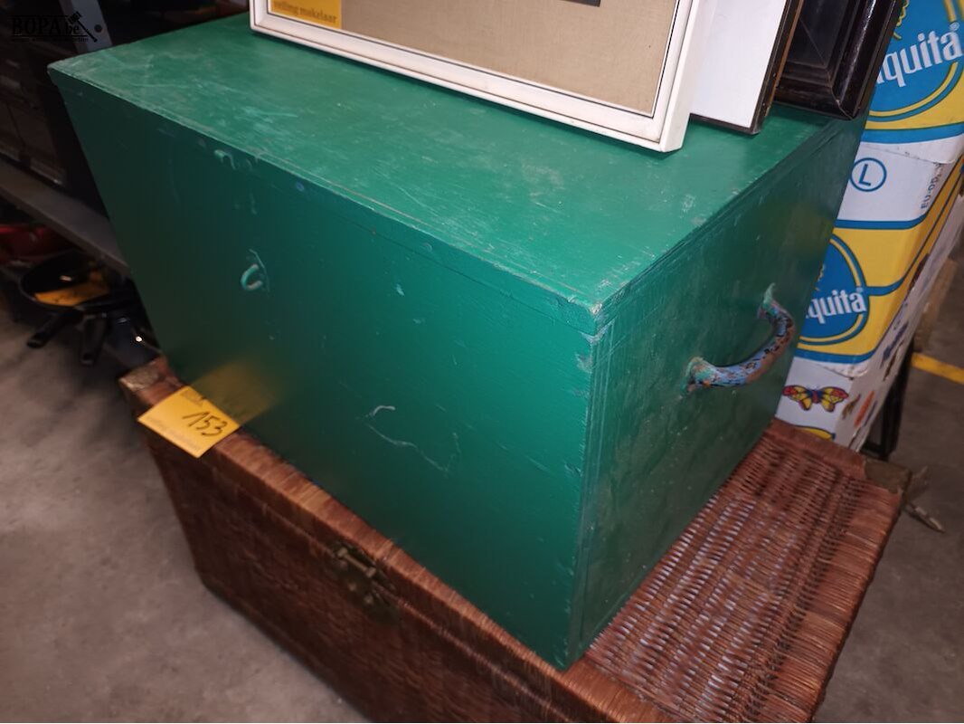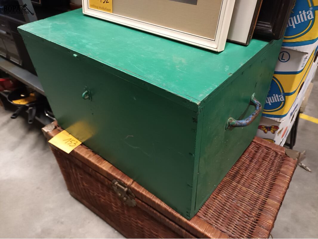 Koffers. 2 stuks. Houten groene koffer. 60X38x33cm. Rieten koffer. 80X40x42cm.