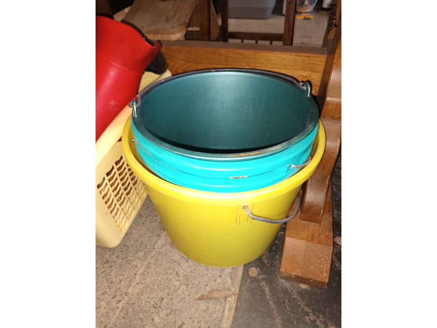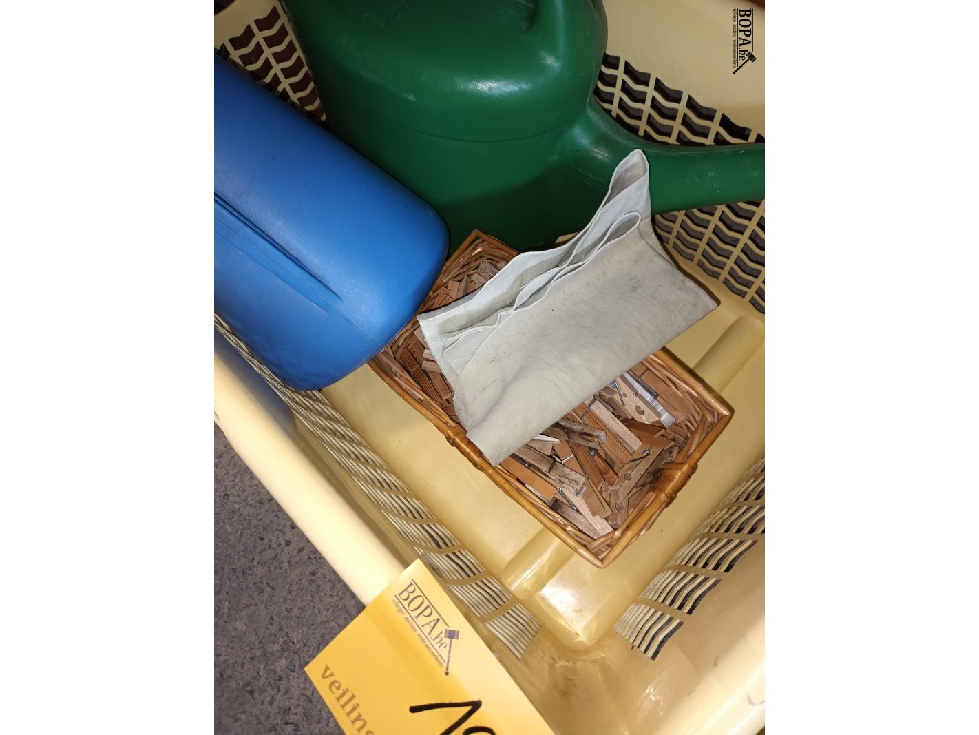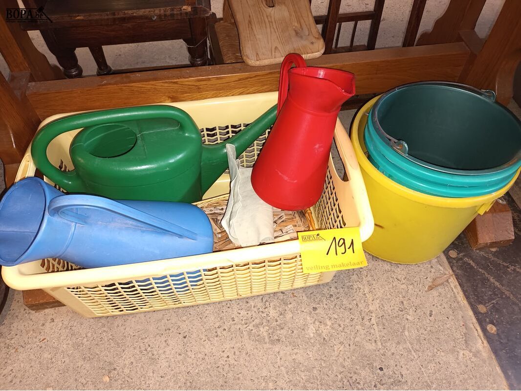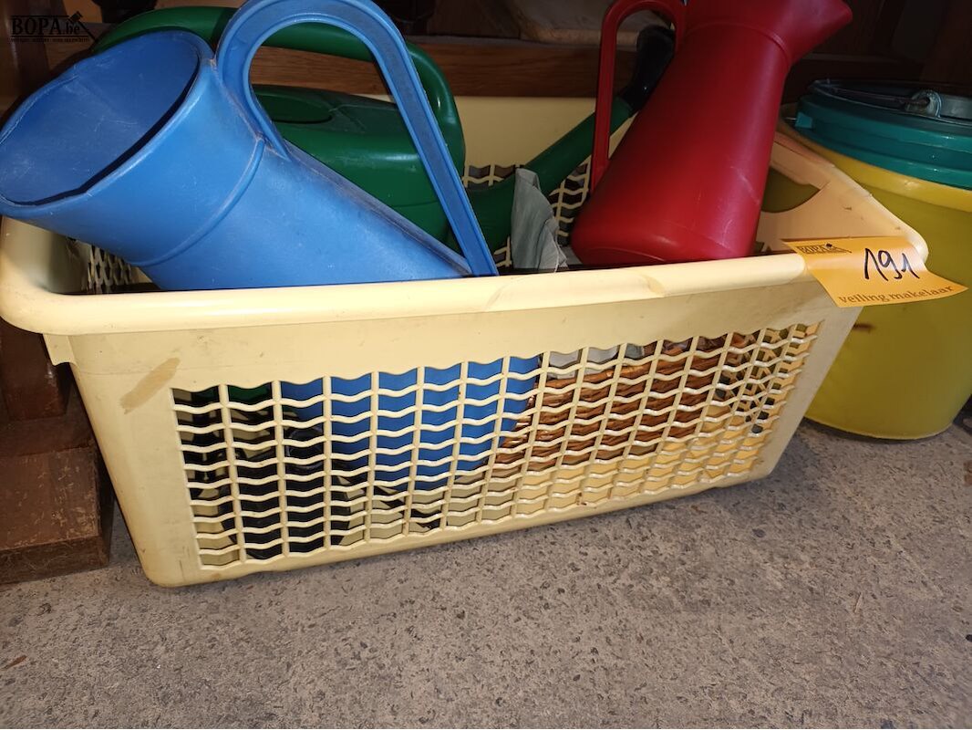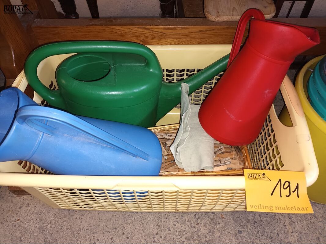 Huisraad in plastiek. 10 stuks. Emmers, wasmand, kannen, gieter, wasspelden.