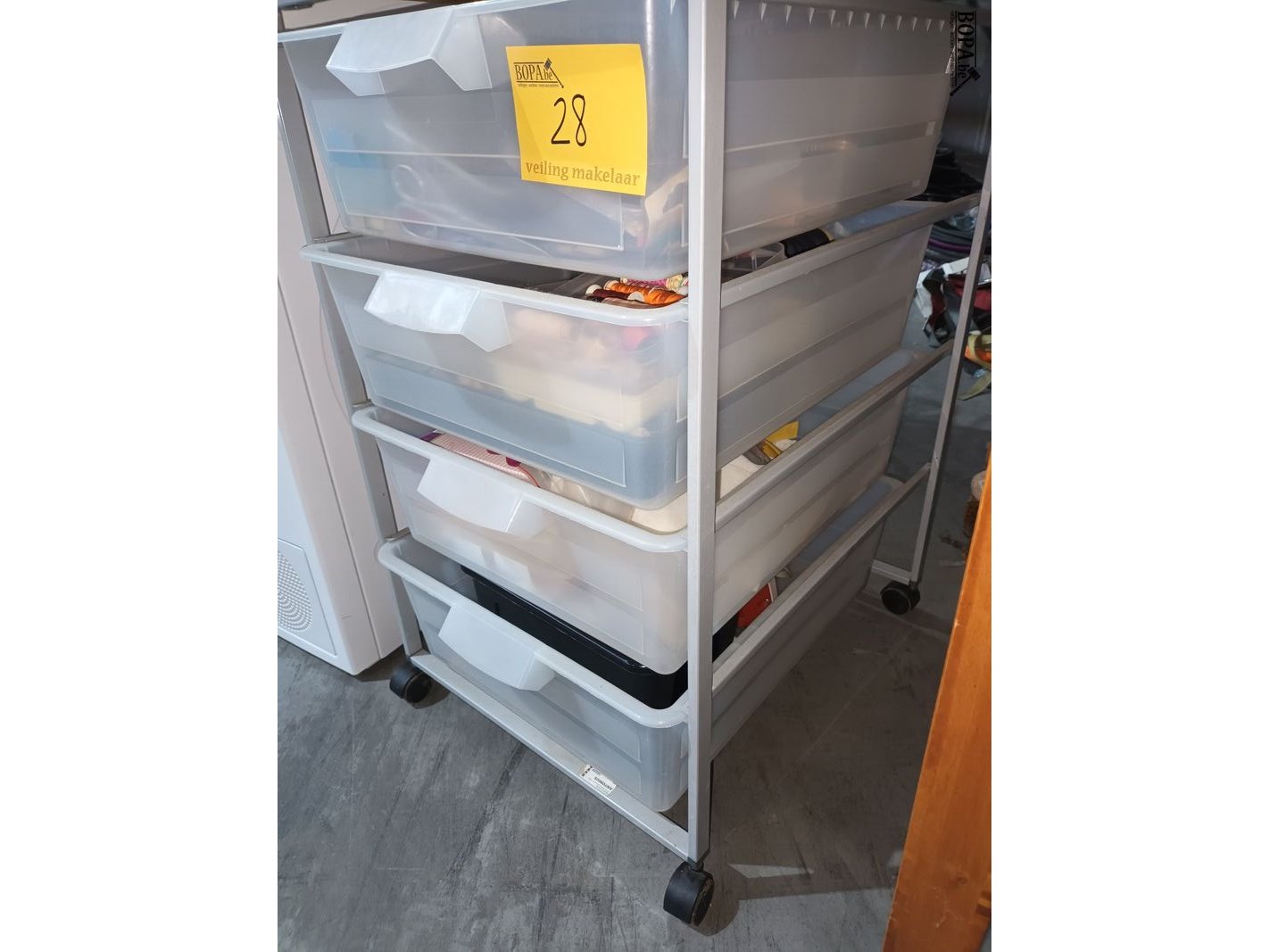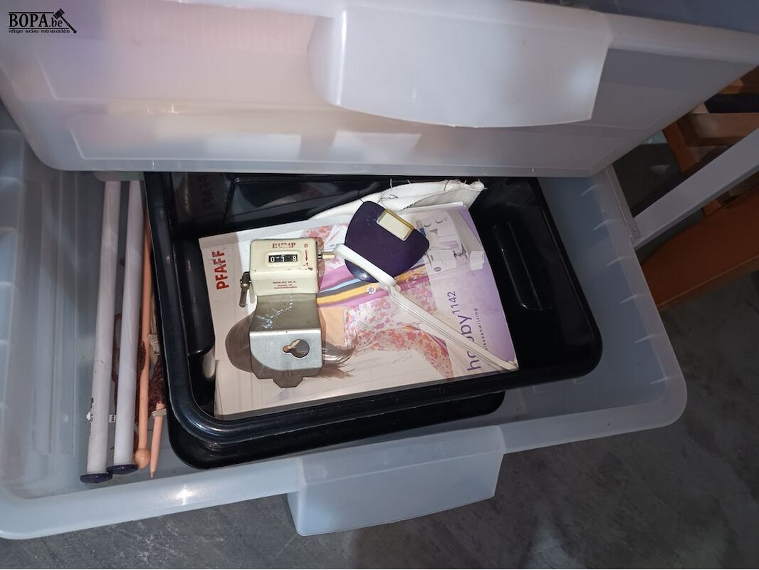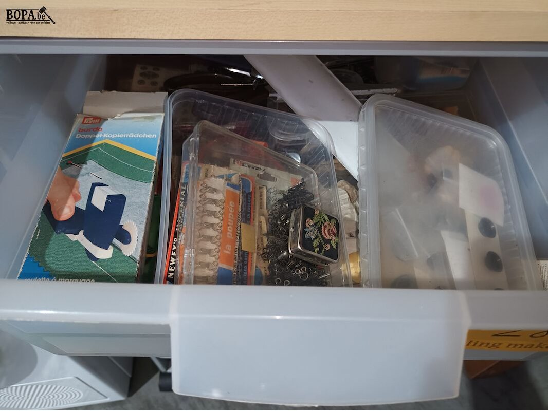 Opbergsysteem op wielen met 4 gevulde opbergbakken met naaigerei.