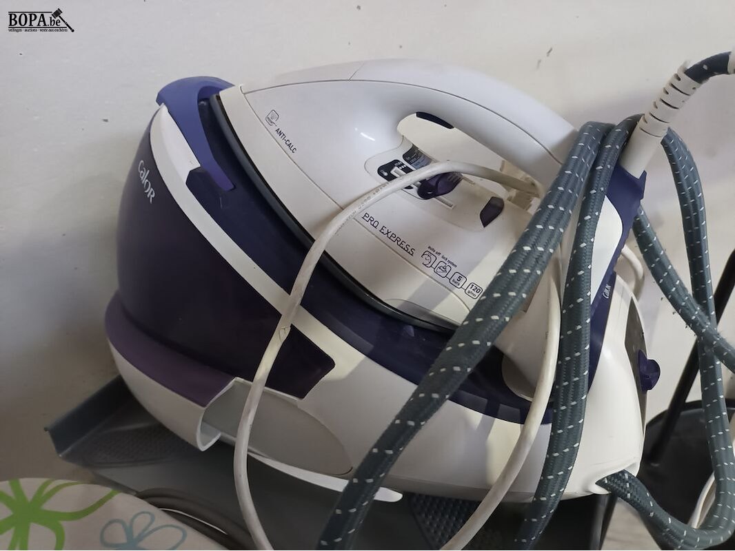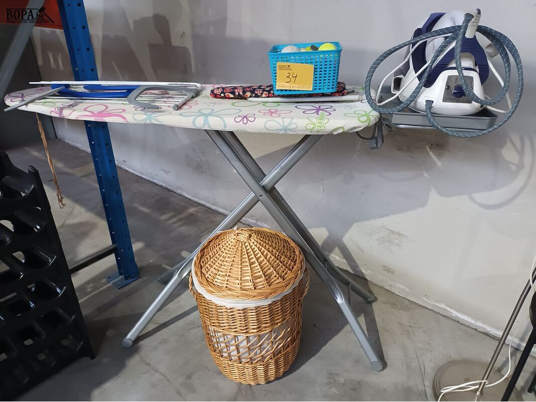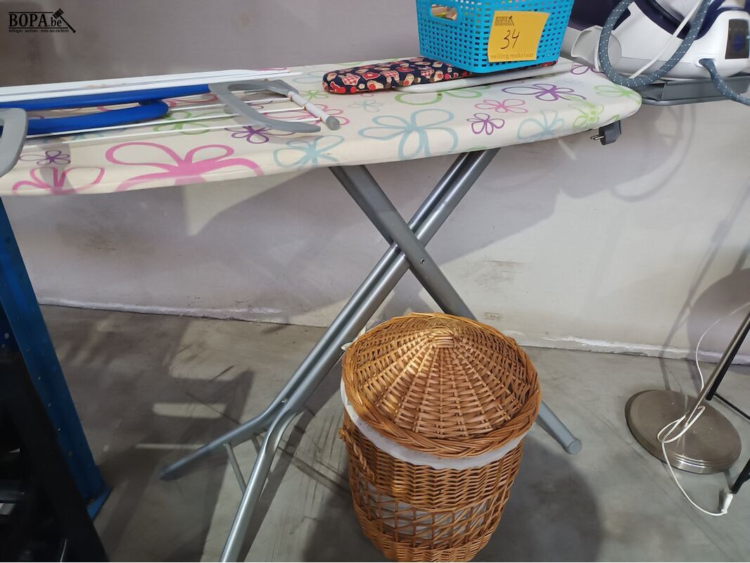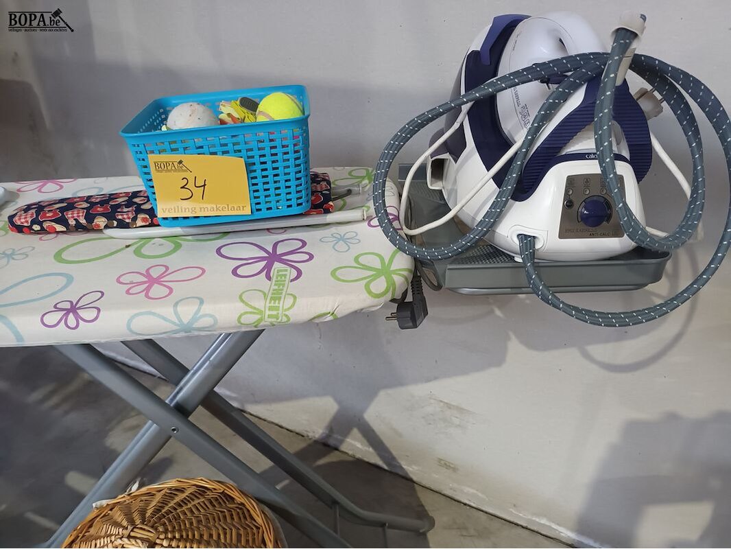 Strijk- en wasgerei. 4 stuks. Wasmand, strijkplank, wasknijpers en stoomstrijkijzer calor.