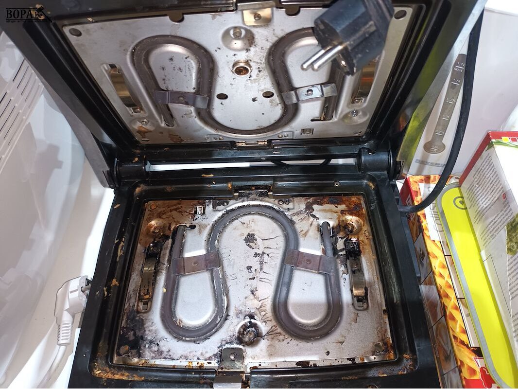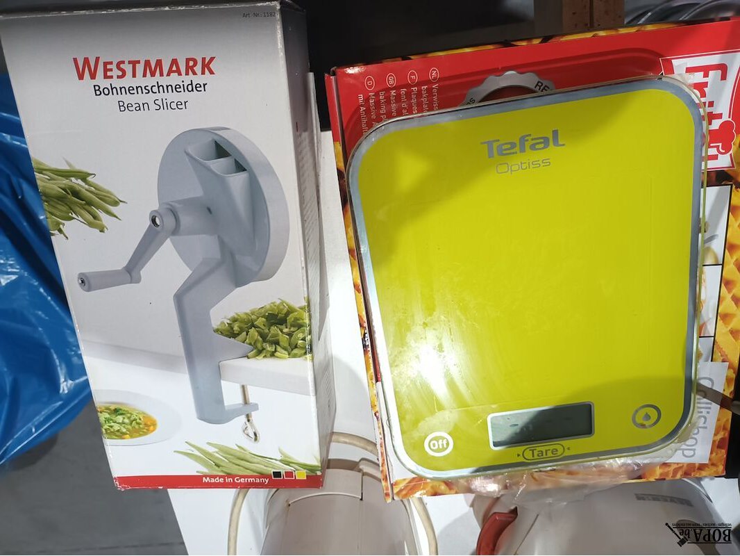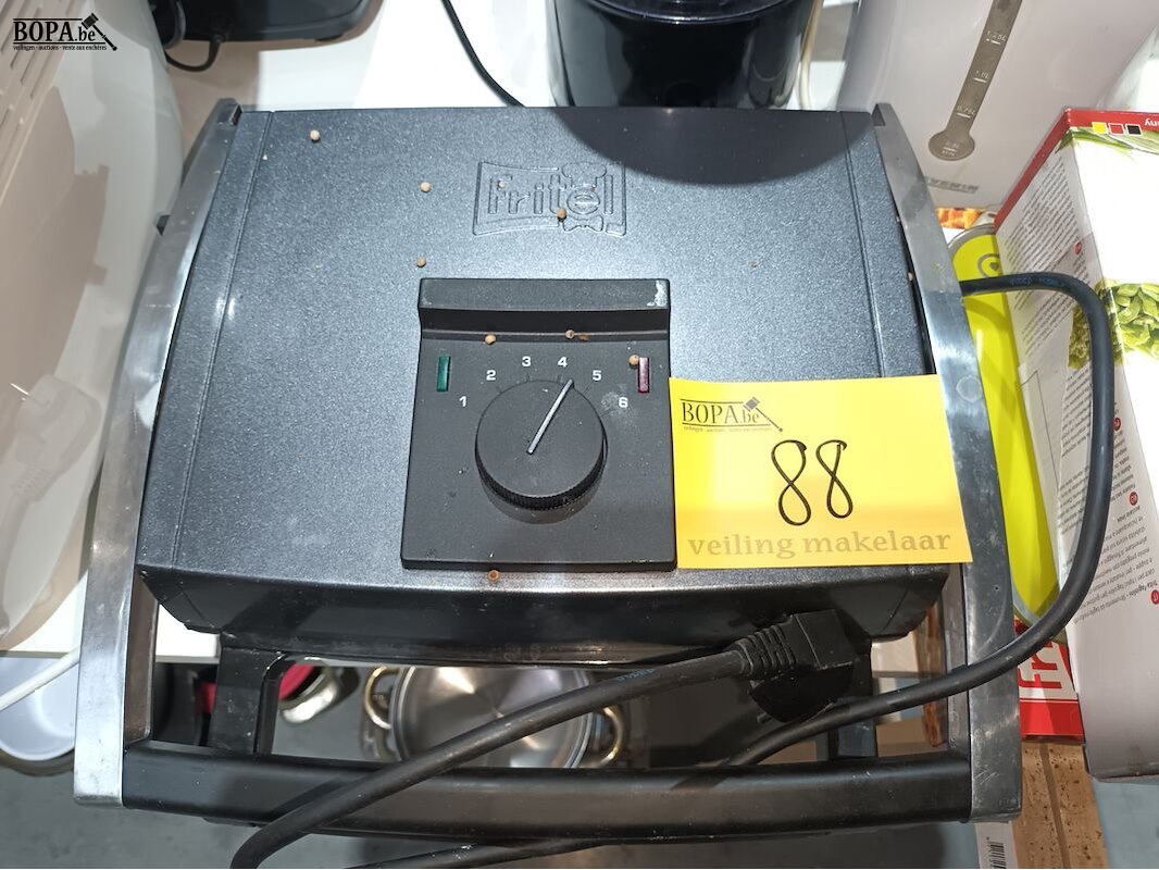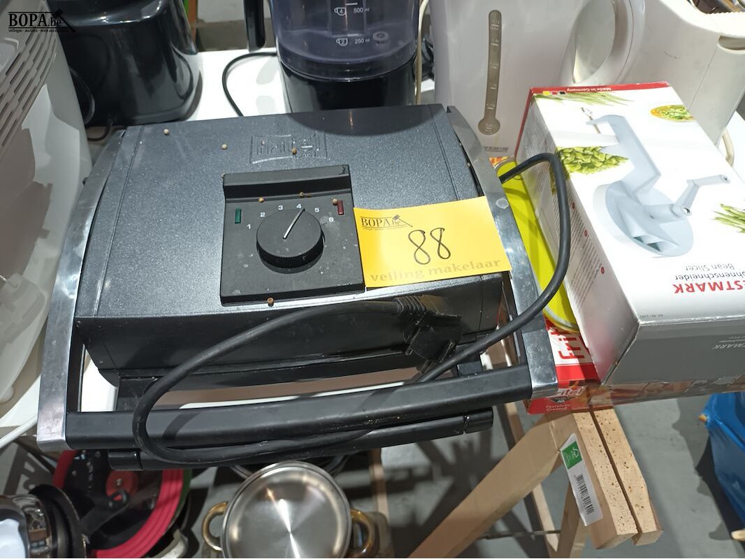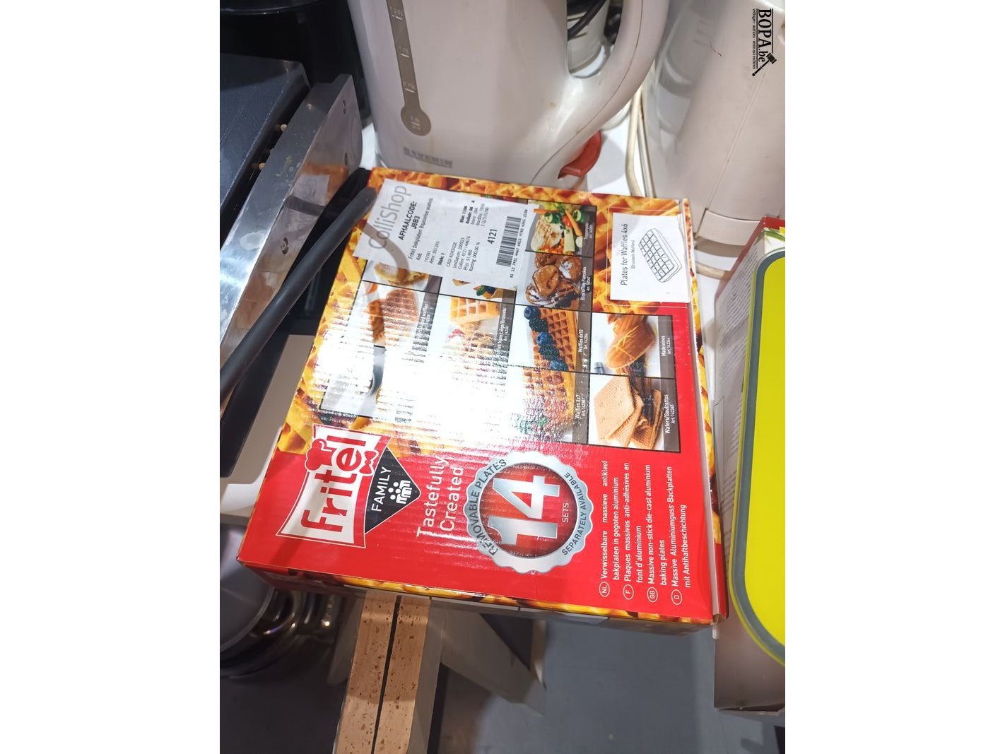 Fritel grill met wafelijzers, bonensnijmachine en keukenweegschaal.