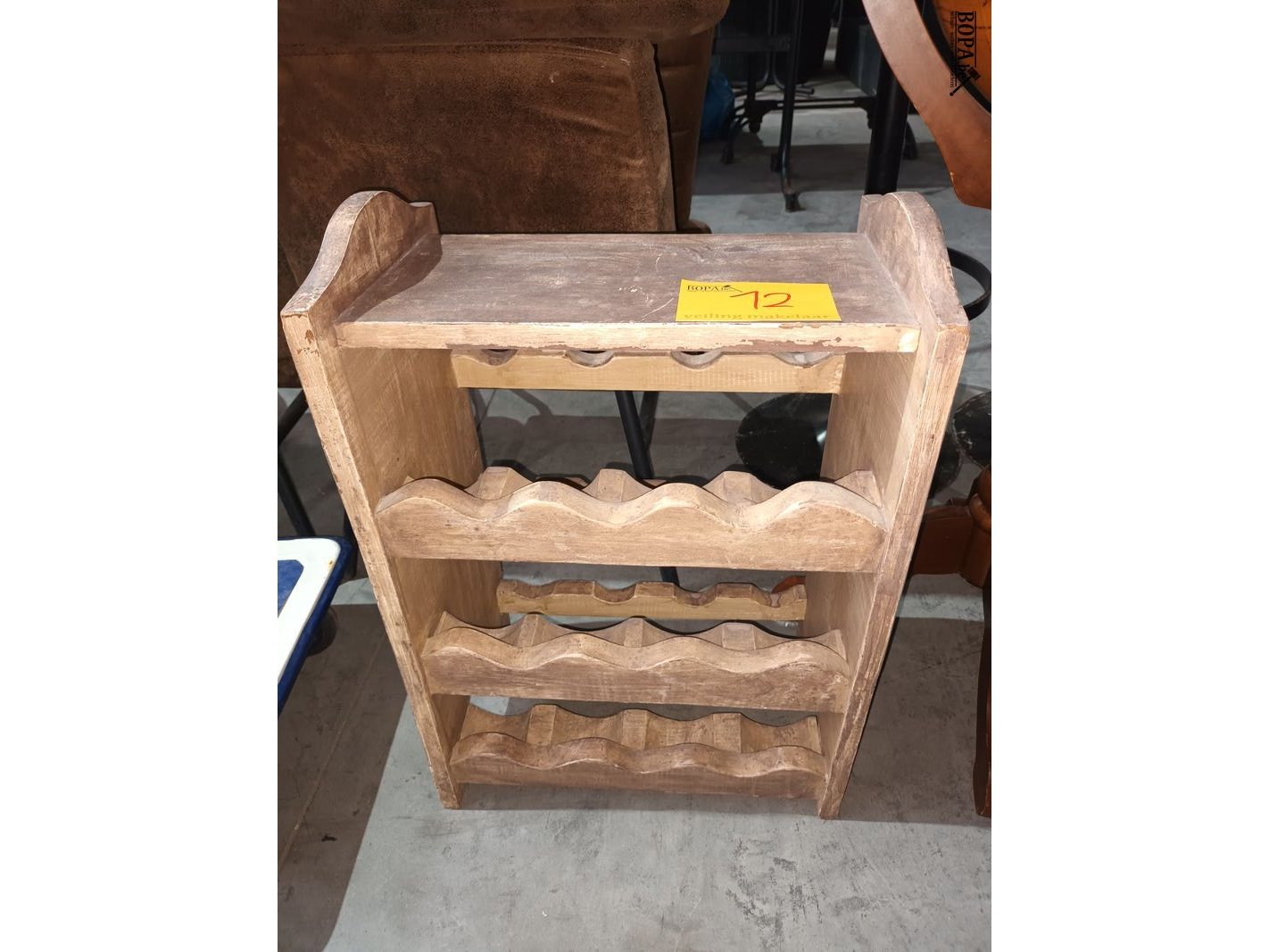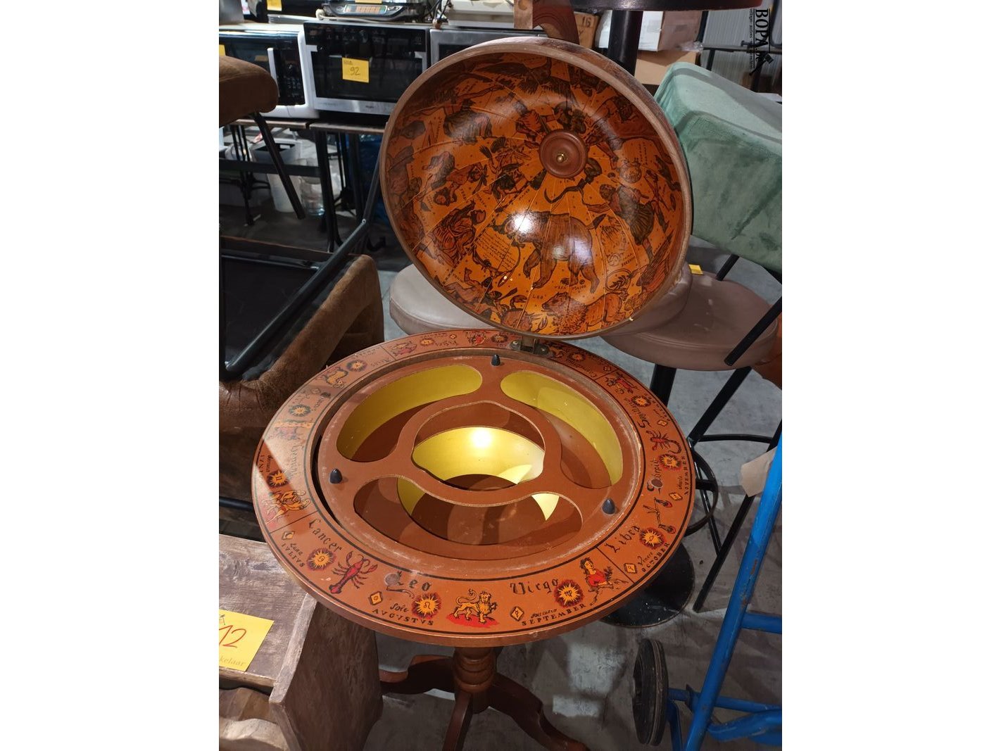 Houten wijnrek (42 x 25 x 60 cm) en een wereldbol barmeubel (diameter 50 cm, hoogte 110 cm).