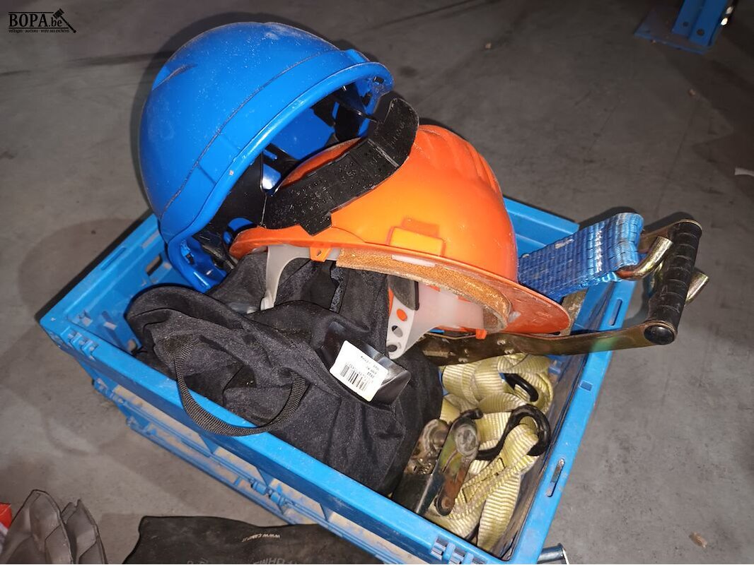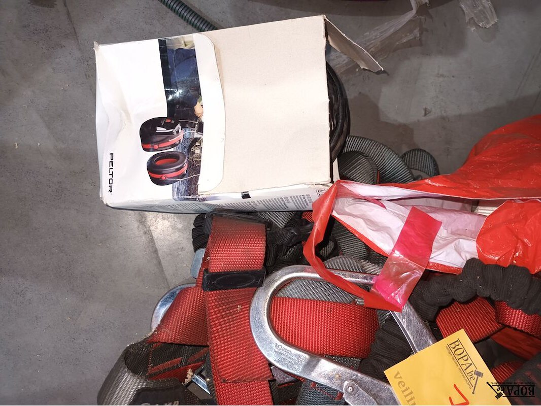 Lot veiligheidsuitrusting zoals helmen, bril, harnas, riemen, etc.