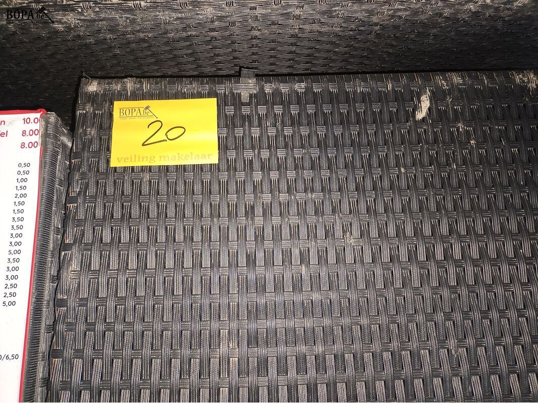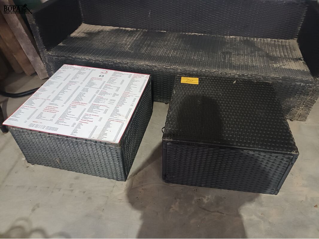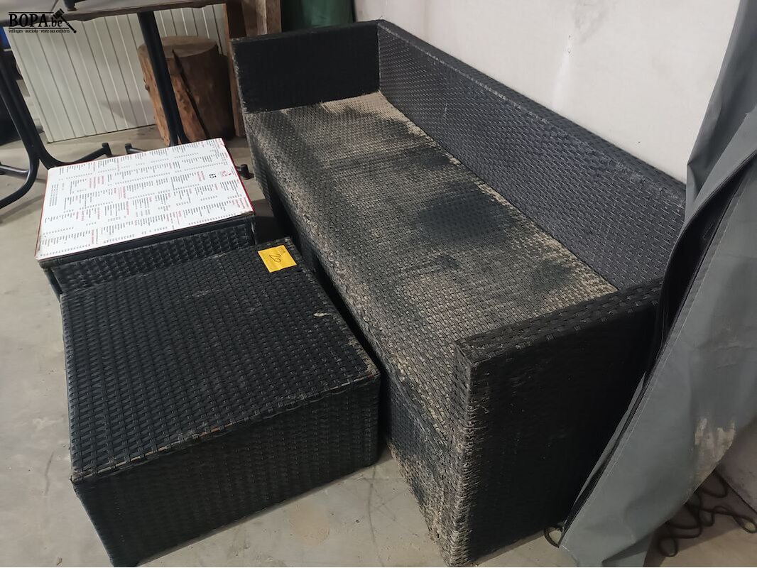 Lounge set in geweven kunststof bestaande uit een bank (190 x 65 x 60 cm) en 2 tafels (60 x 60 x 32 cm).
