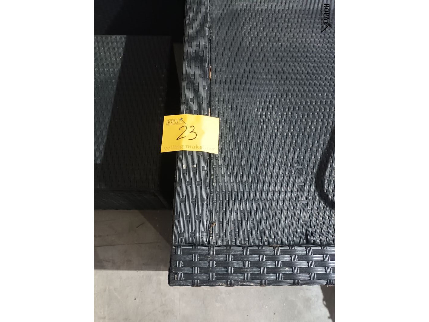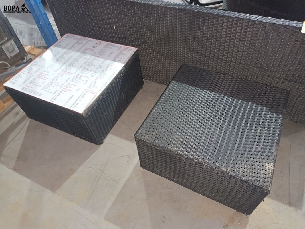 Lounge set in geweven kunststof bestaande uit een bank (190 x 65 x 60 cm) en 2 tafels (60 x 60 x 32 cm).
