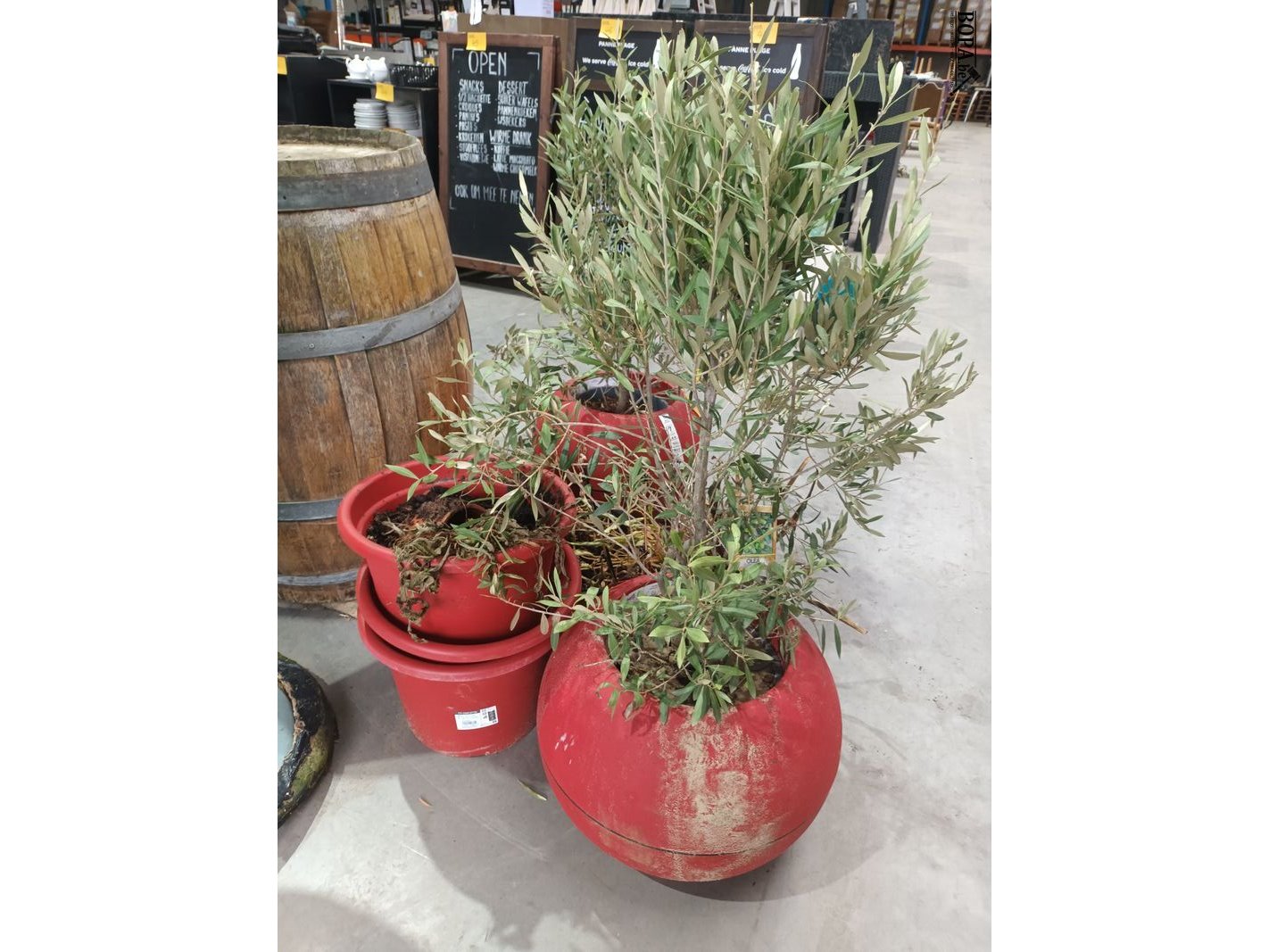 8 diverse rode plantenpotten met onder andere 2 olijfboompjes.