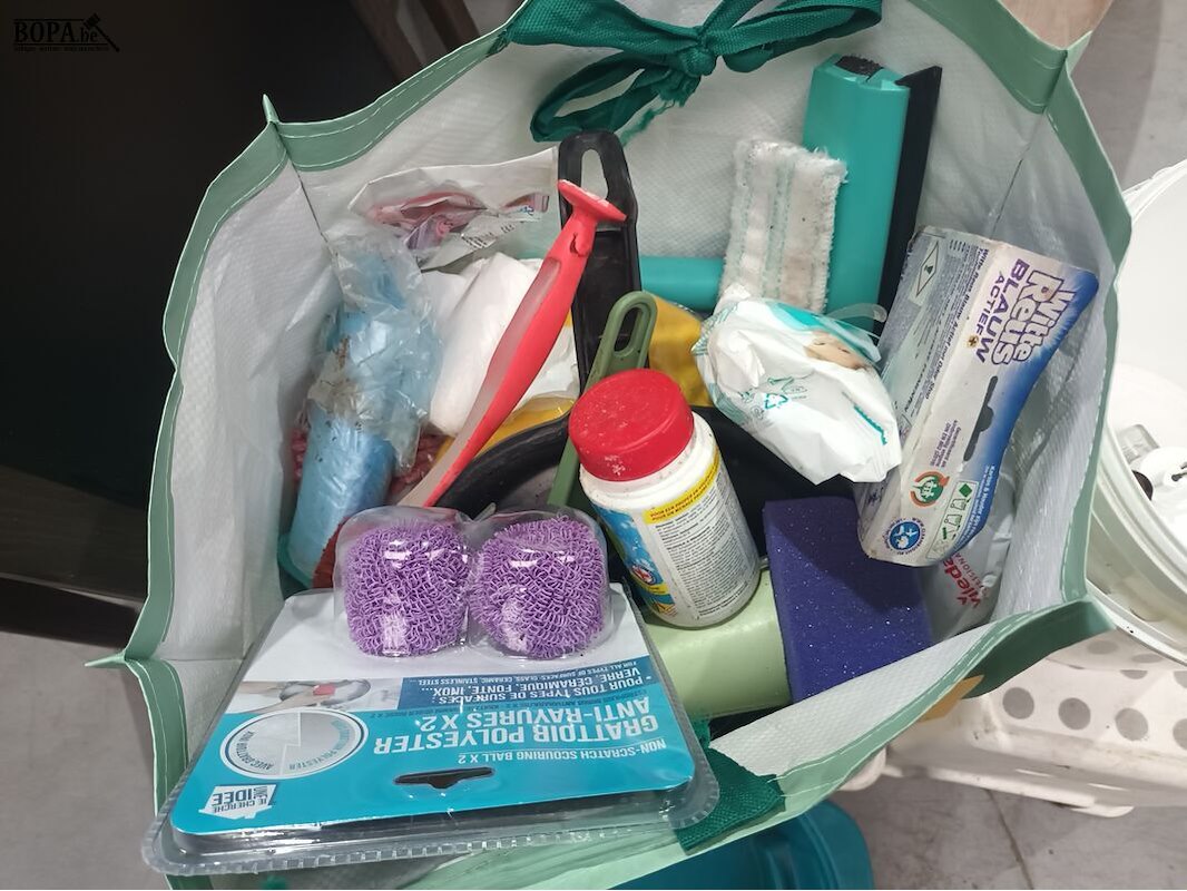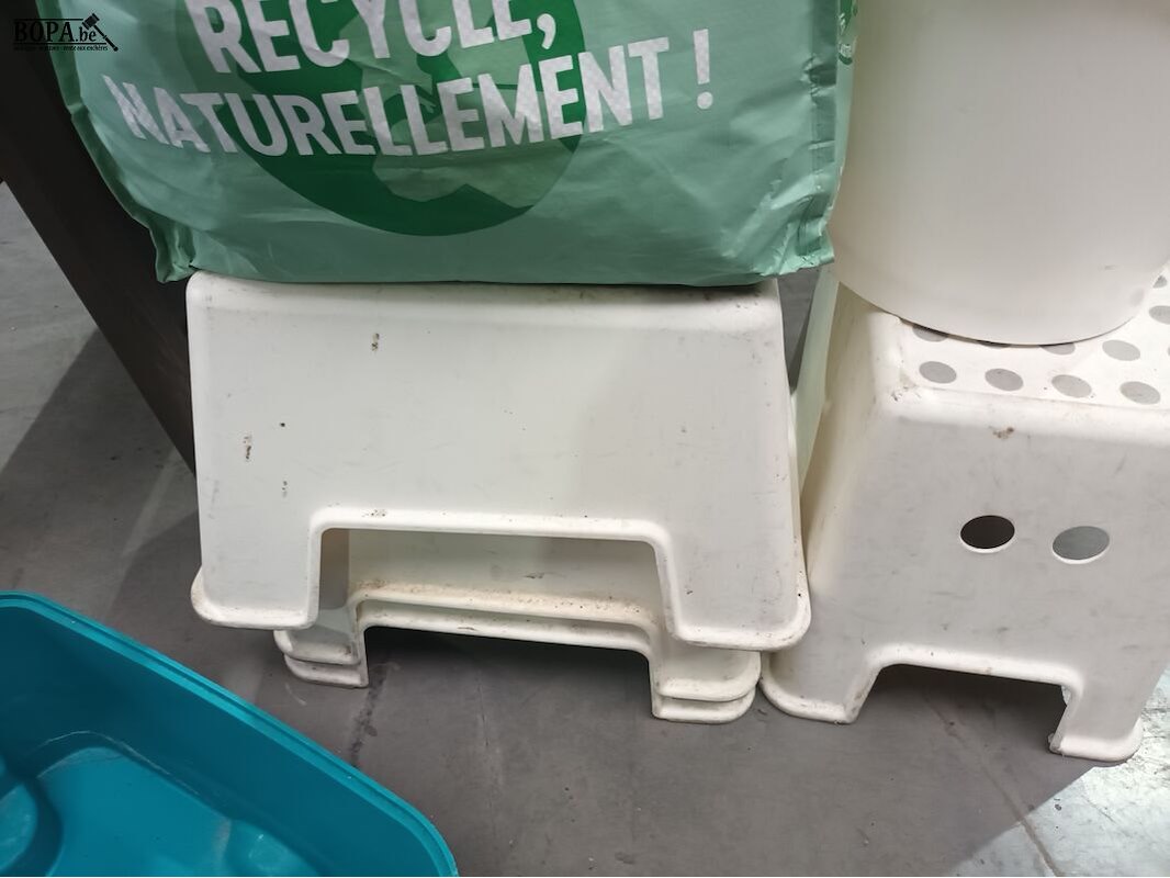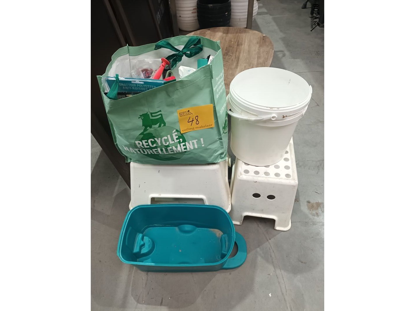 4 opstapjes, emmers en een zak poetsmateriaal.