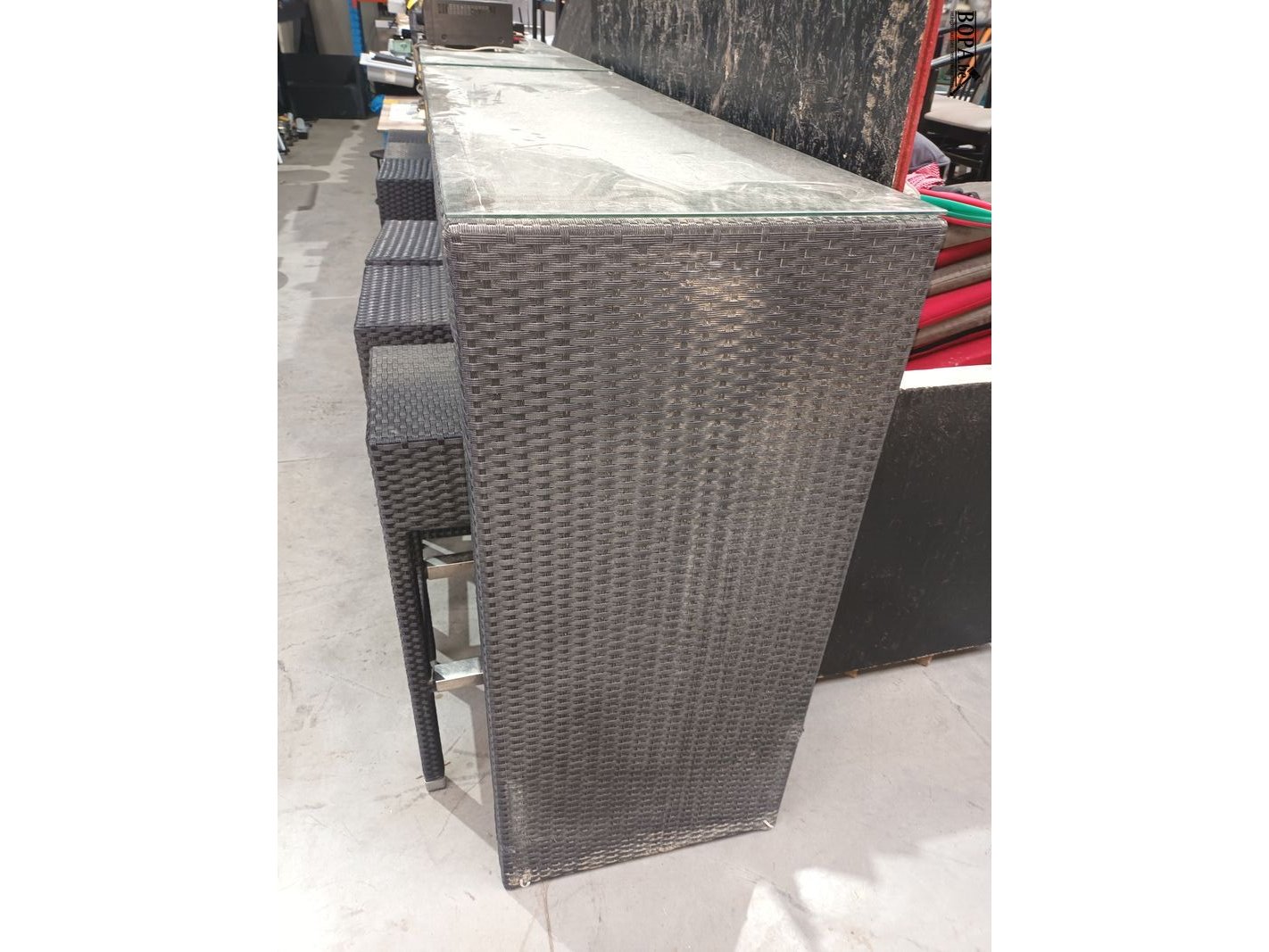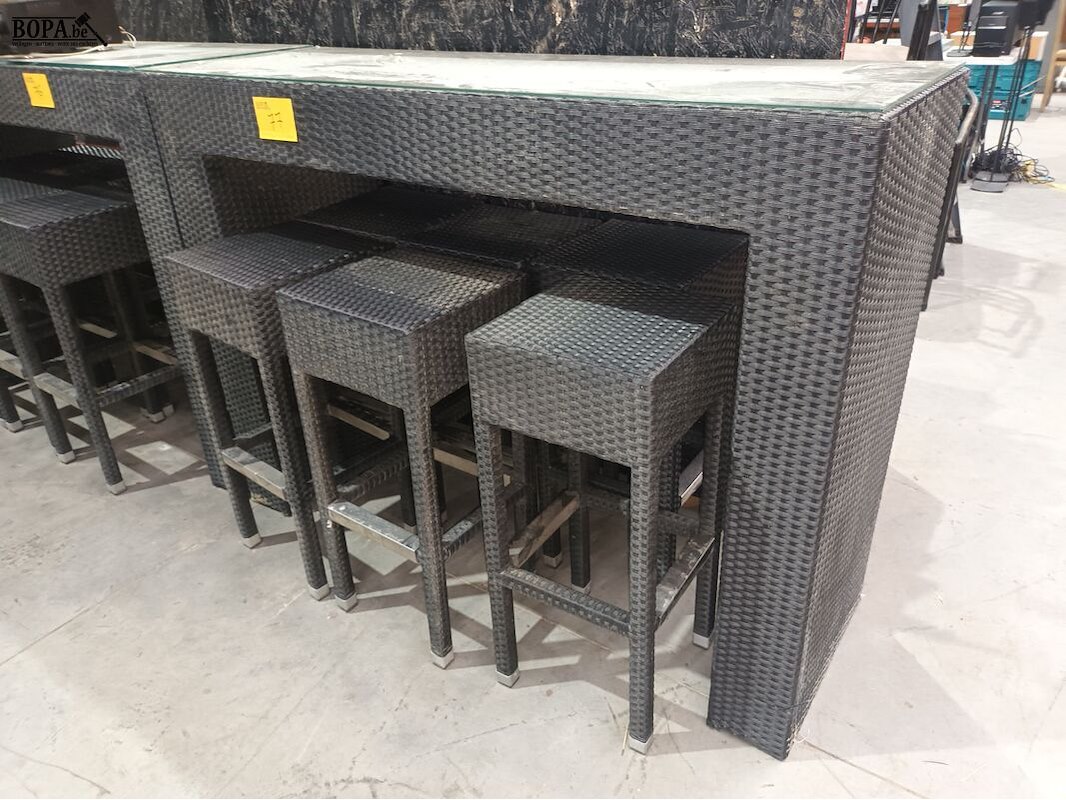 Hoge tafel (150 x 50 x 110 cm) met glazen blad en 6 krukken (33 x 33 x 77 cm). Alles in geweven kunststof.