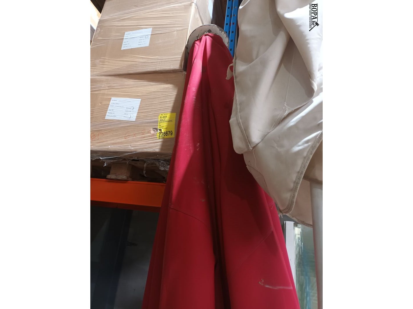 Grote rode parasol met hoes. Hoogte 290 cm.