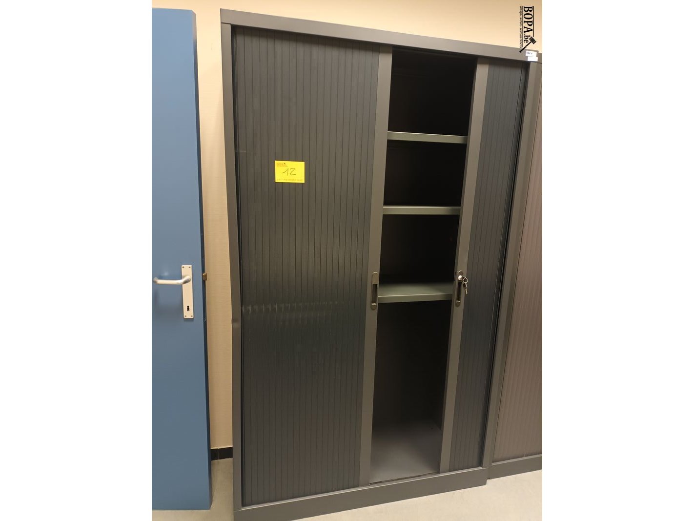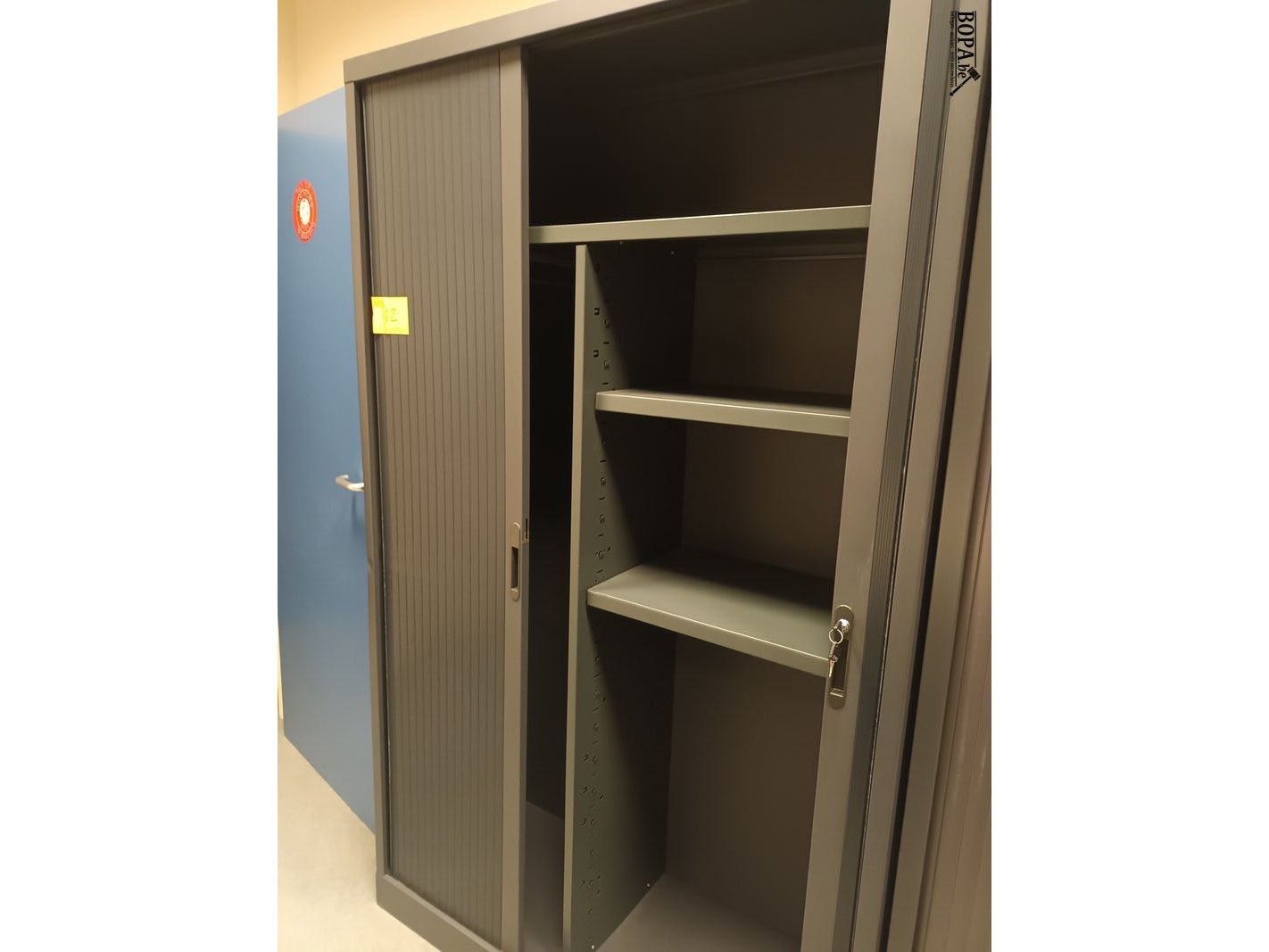 Hoge antraciet roldeurkast. 120 x 45 x 198 cm. Met slot en sleutel.