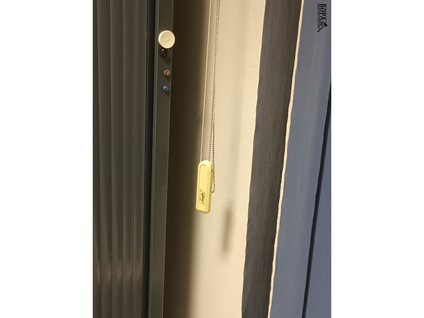 2 x donkerblauwe gordijnen met stoffen lamellen Luxaflex. 130 x 220 cm.