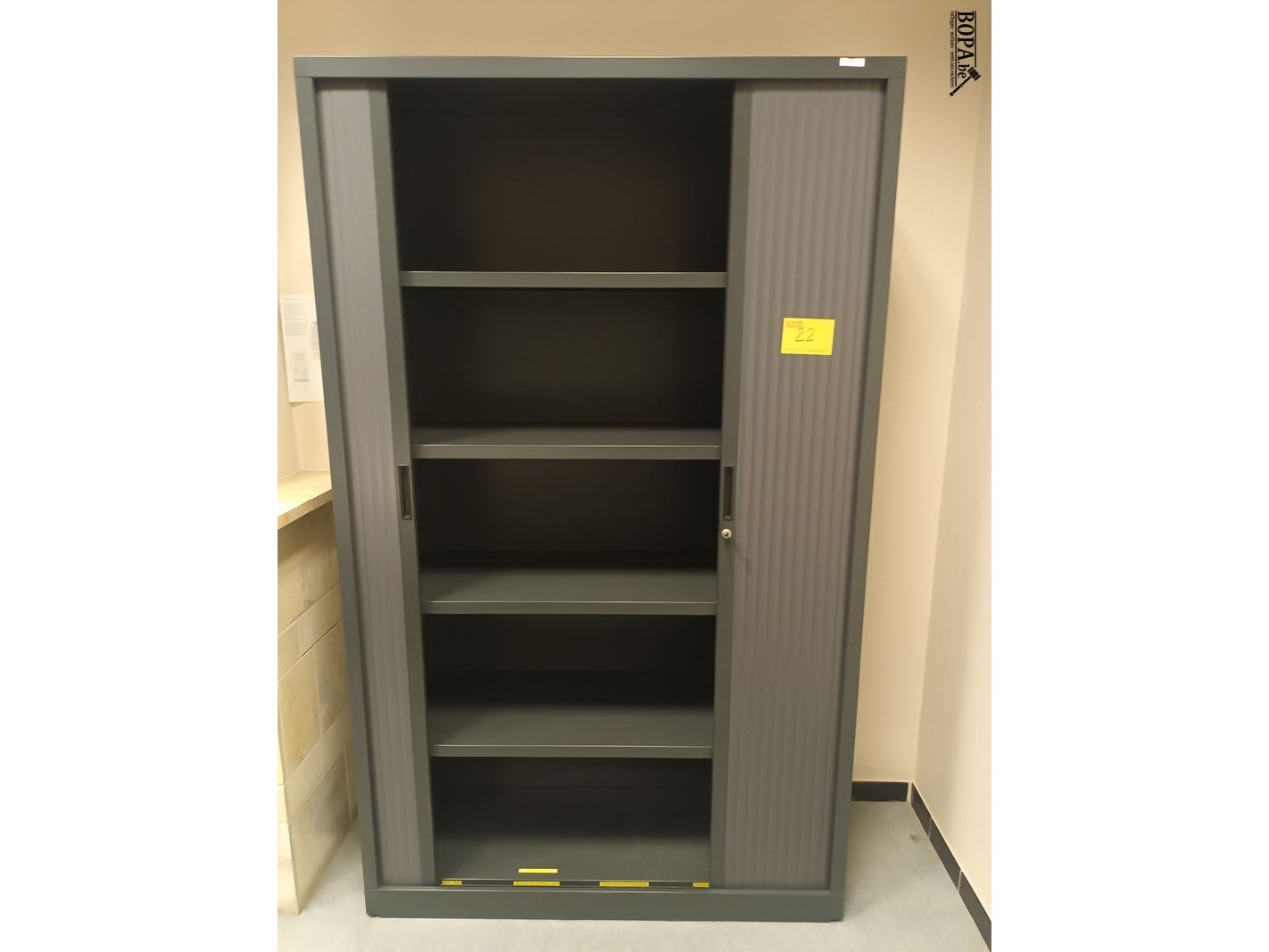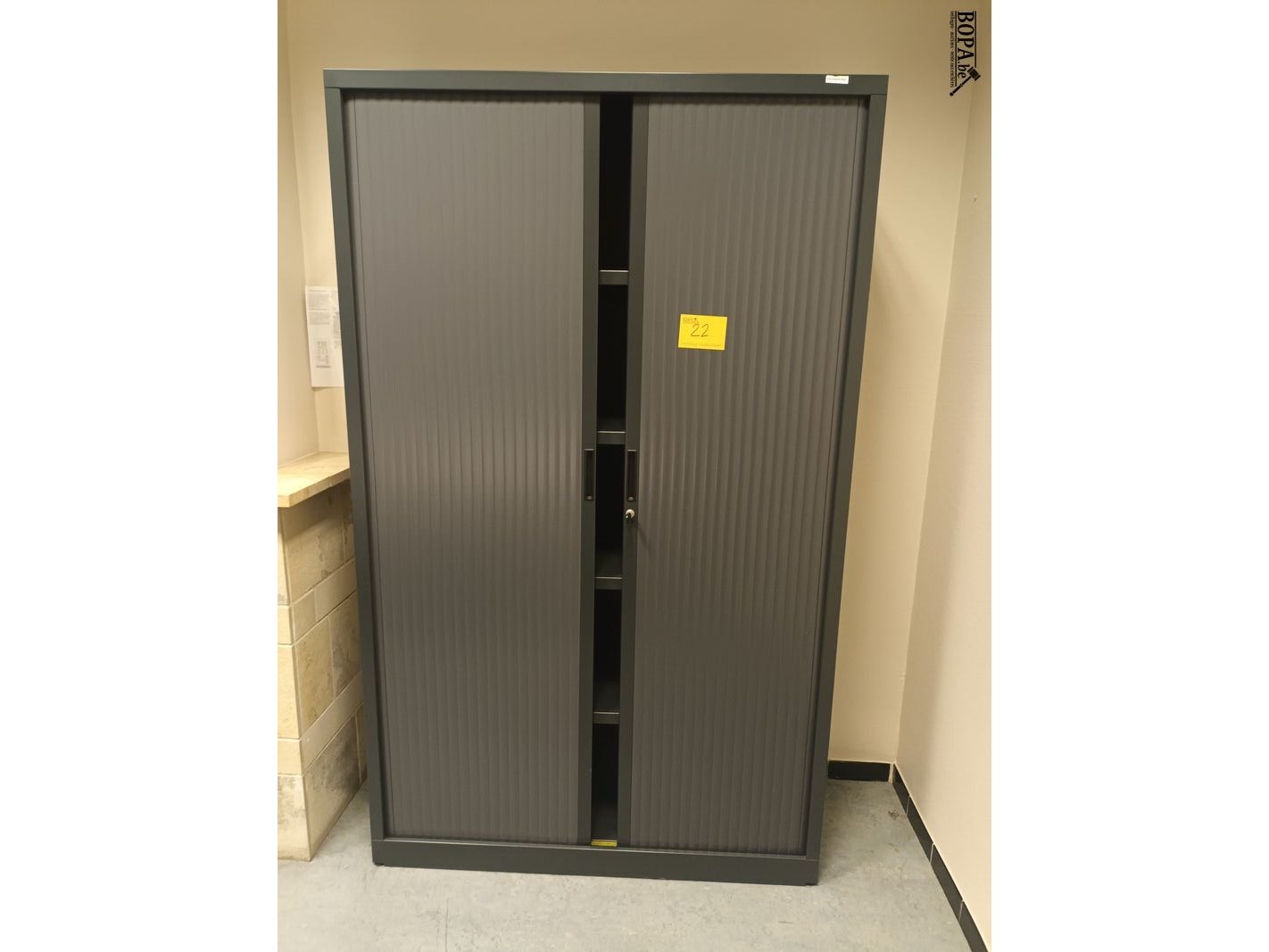 Hoge antraciet roldeurkast. 120 x 42 x 200 cm. Met sleutel.