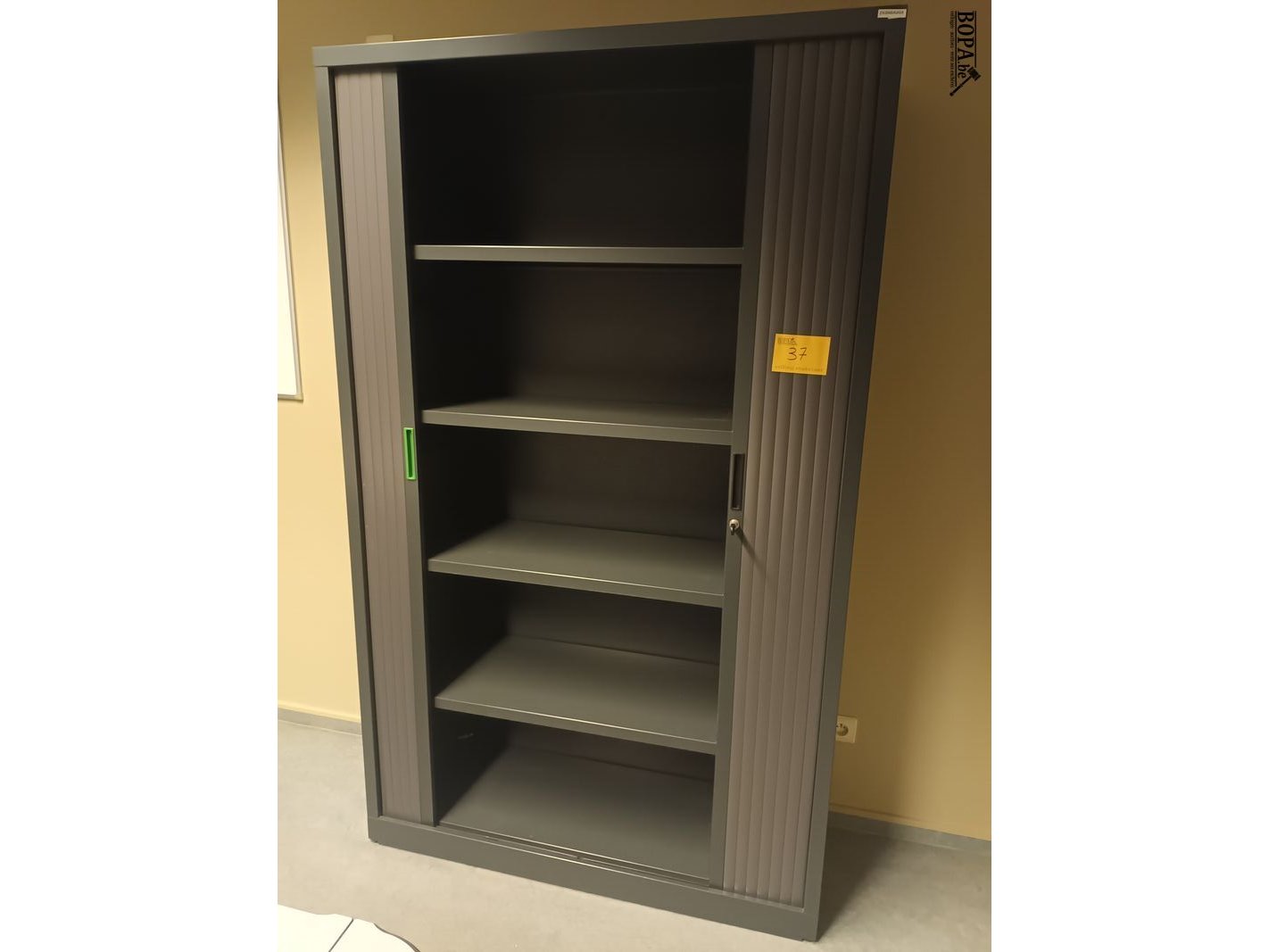 Hoge antraciet roldeurkast. 120 x 42 x 200 cm. Met sleutel.