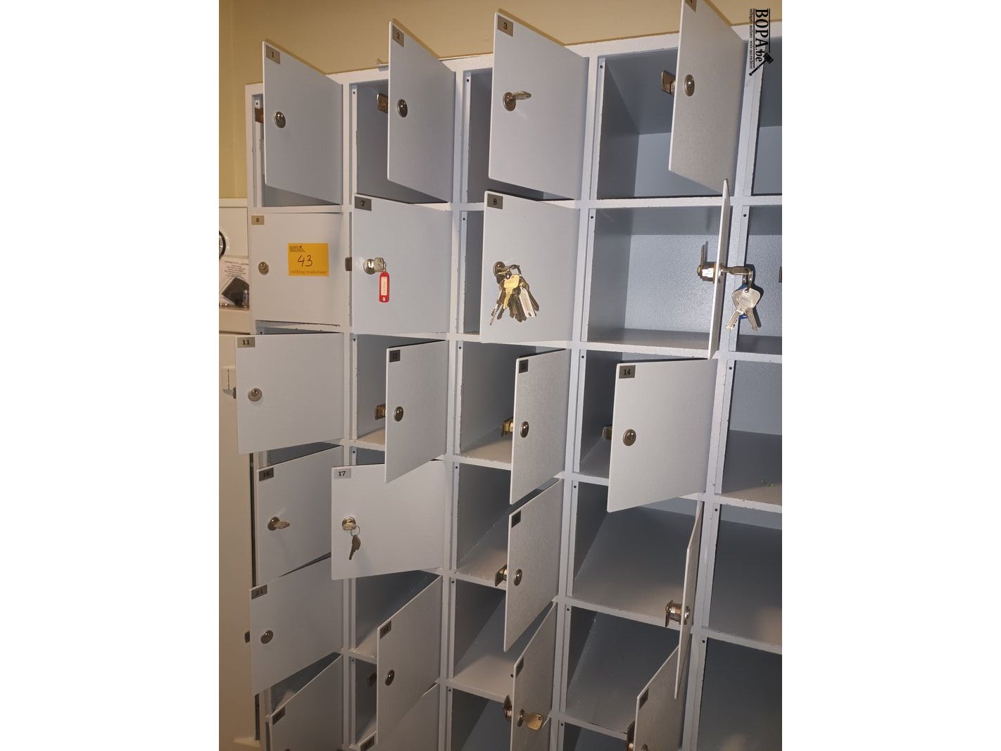 Lockerkast met vakjes. 140 x 60 x 197 cm. Nog los te maken van de muur en de kluis.