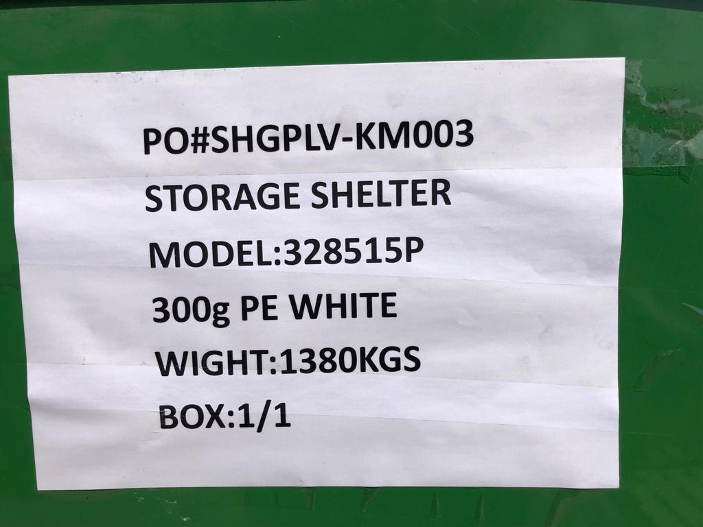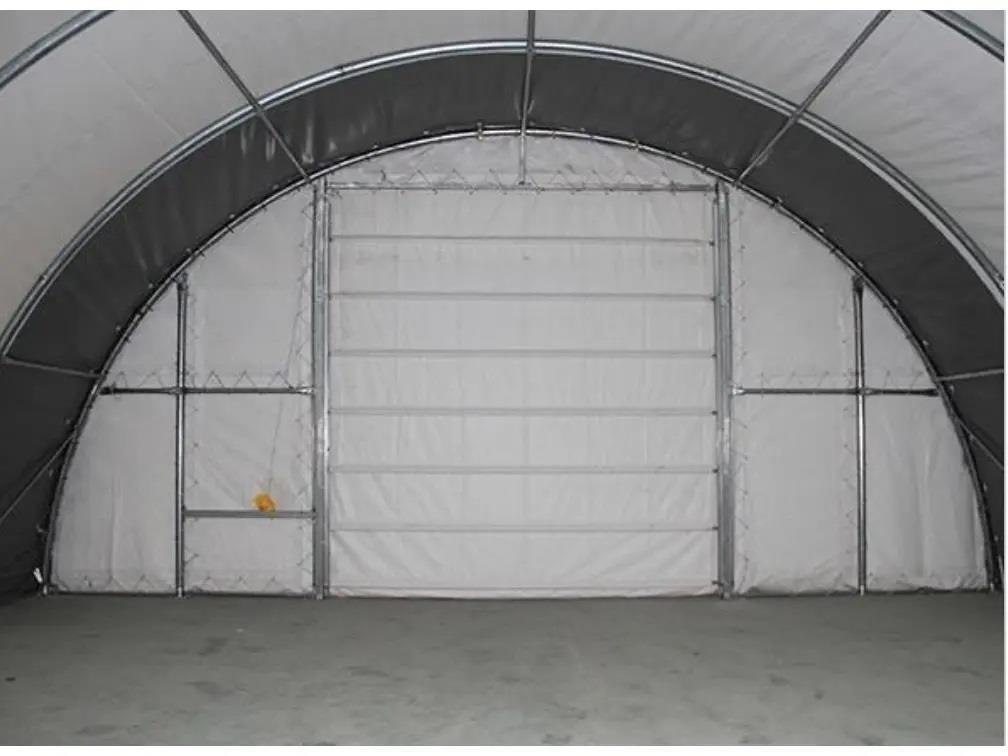 Eversteel Opslag tent/Storage Building, afmeting: 26x10x4,5 mtr, 1380 kg, gegalvaniseerde buizen, met oprolbare deur (maat: 3,5x3,5 mtr) verpakt in ijzeren krat.