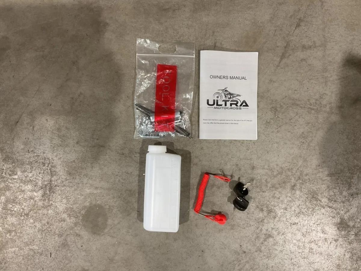 Voorzien van 49 cc benzine motor met electrische start, schrijfremmen voor en achter; 2 sleutels; dodemansknop en koord; voor bumper; inclusief toebehoren; ongebruikt in doos