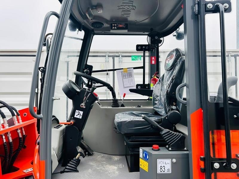 Algemene informatie - v.v. Quick Hitch (snel wissel); maximale hefhoogte 2980mm; rijsnelheid: 22 km/h; 4WD; Luxe volledig gesloten cabine; V.v. 1 deur; te openen raam; geveerde stoel; radio; ventilator en verwarming; Kantelbare cabine ivm vereenvoudigd onderhoud; graafbak van 0.53 m3 en palletvorken; totale afmeting met graafbak; Rated load 1200KG; Eigen gewicht 4000KG; 36,8 Kw; 5190x1770x2600m