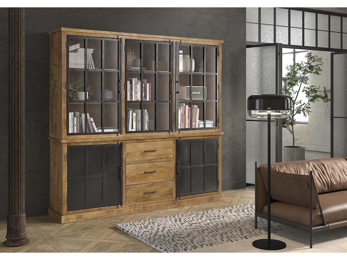 Tweedelige vitrinekast (boven- en onderkast) in massief mangohout en metaal 220x45xH210 cm