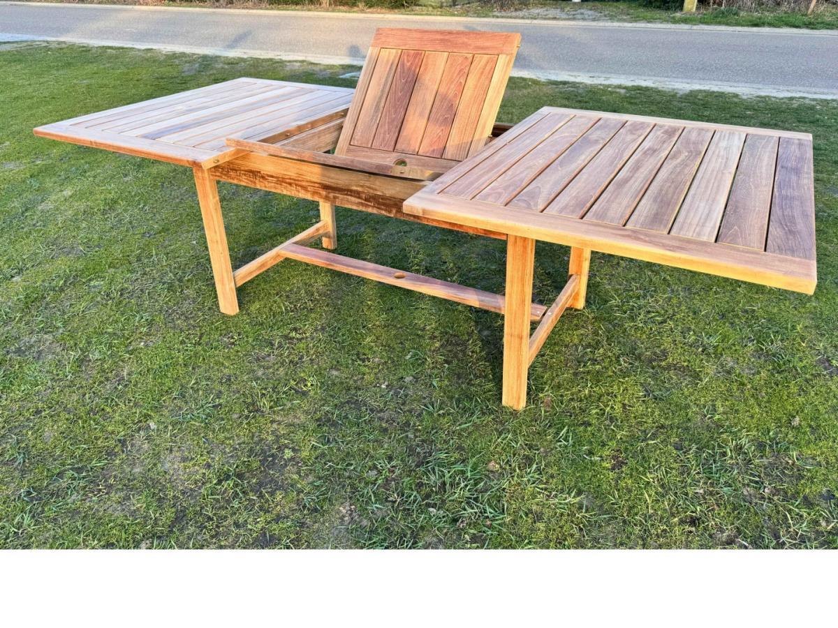 Verlengbare rechthoekige tuintafel in massieve teak. Afmetingen: L180/240 x B100 x H75 cm: Deze tafel van massief teakhout heeft dus een verlengstuk van 60 cm in het midden van het tafelblad. Het verlengstuk bevindt zich onder het tafelblad. Je hoeft slechts even te trekken aan beide zijden van de tafel om het midden van het blad te openen, waar je het verlengstuk uit kunt halen dat eenvoudig kan worden uitgeklapt. extra dik. In het midden van de tafel zit een opening voor een parasol (welke kan gesloten worden indien u geen parasol nodig heeft).