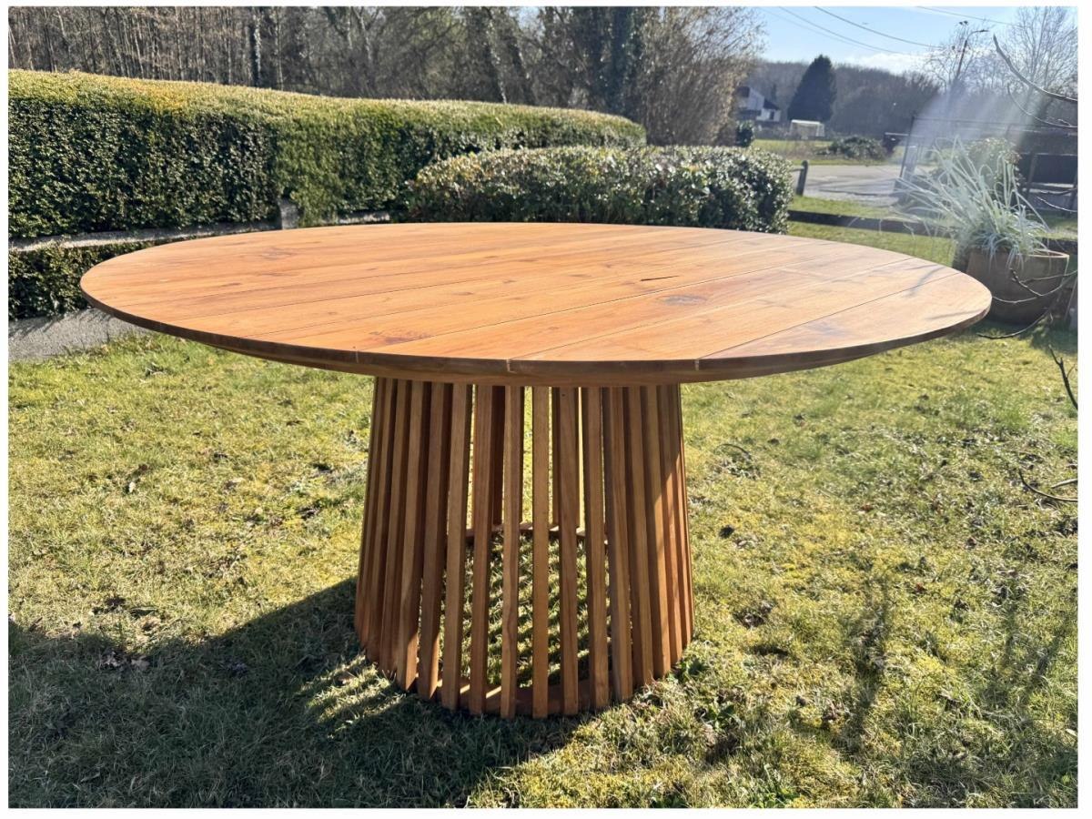 Deze tuintafel is een stijlvolle ronde tafel van teakhout met een diameter van 150 cm. Ideaal voor gezellige diners en samenkomsten in de buitenlucht, biedt deze tafel een elegante uitstraling dankzij de conische poten en fijne teakhouten latjes. Het natuurlijke ontwerp past perfect in elke tuinsetting en straalt tijdloze klasse uit.Afmetingen: 150x78cm