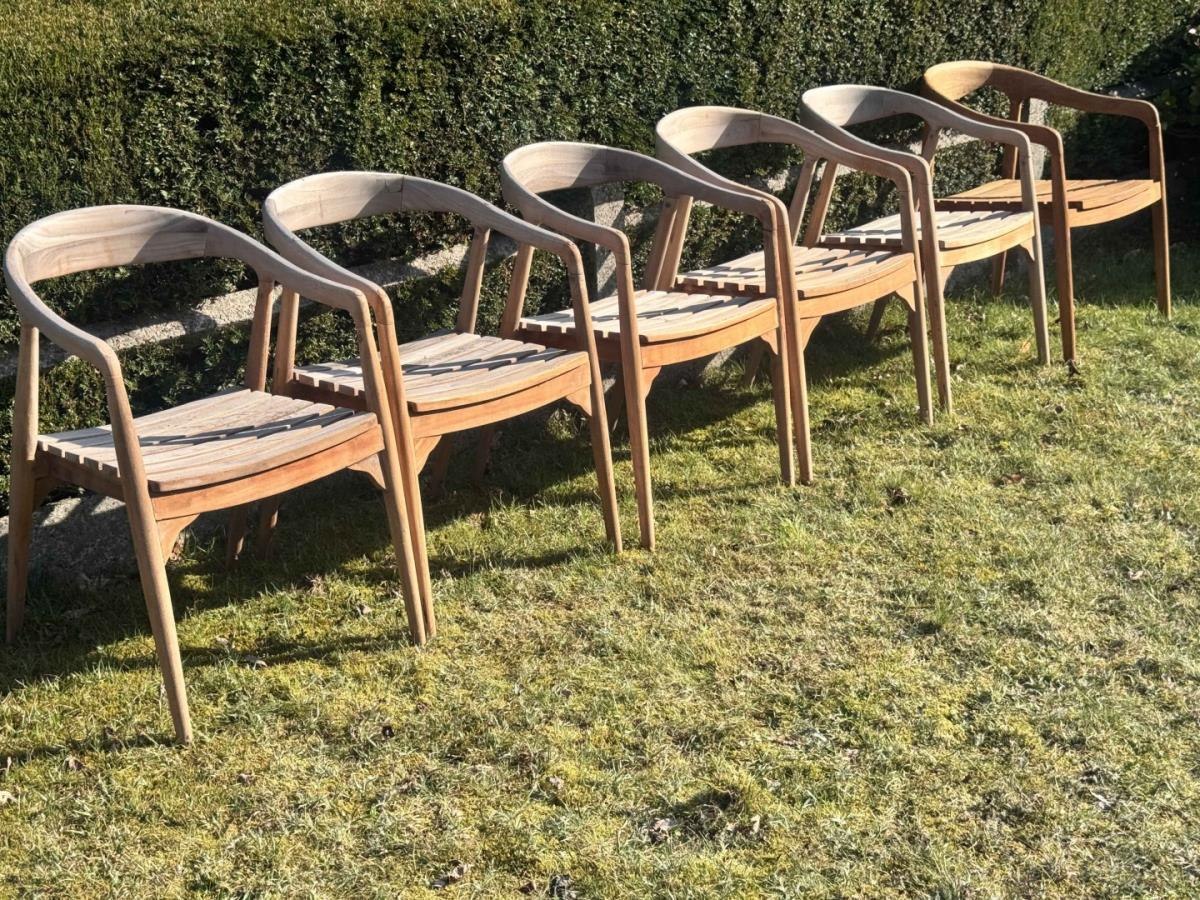 Set van 6 teak stoelen met afgeronde rug (lichte schade)