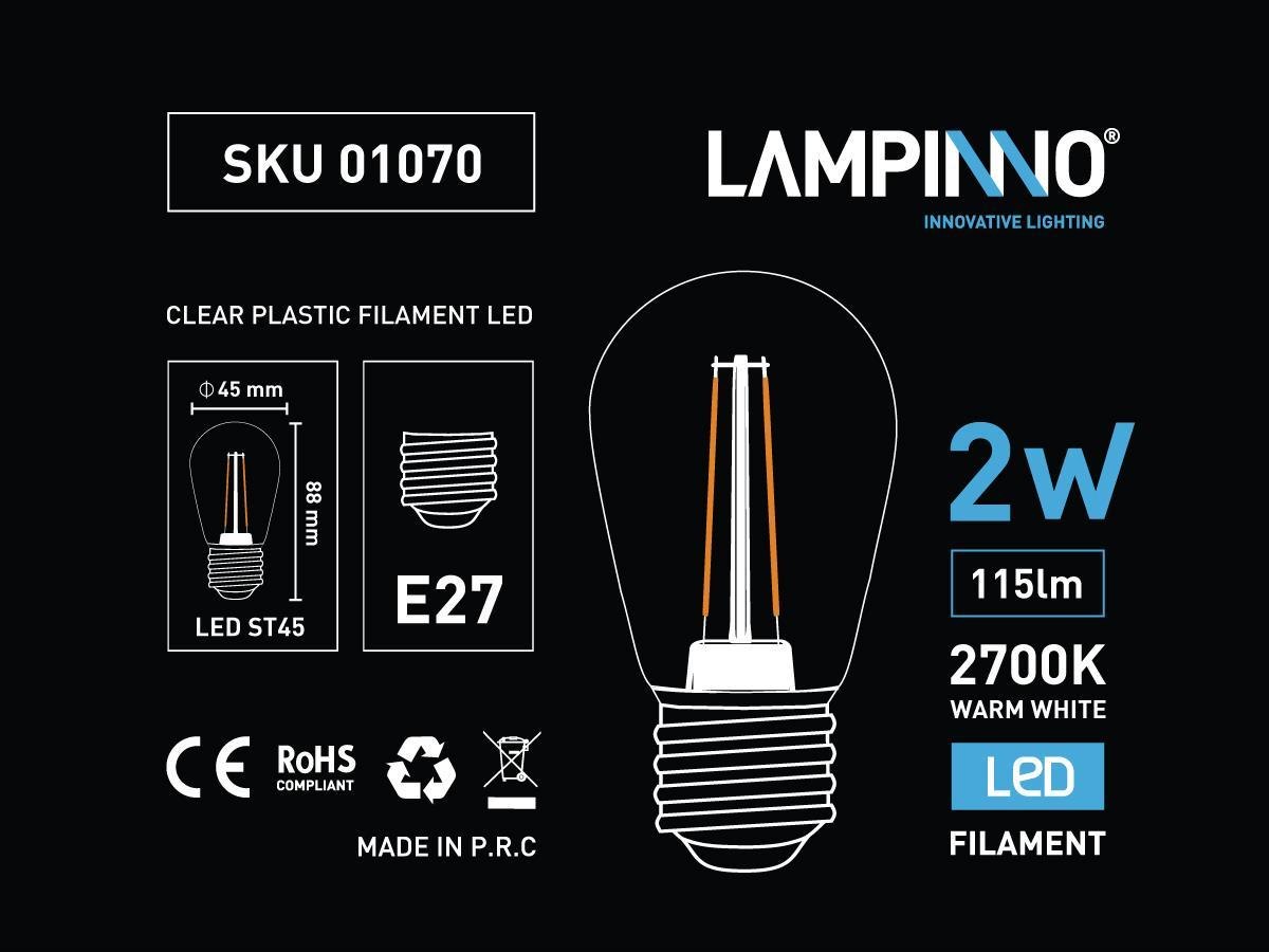 50 x 2 watt E27 ST45 Filament LED Bulb 2700K - lichtstroom 140 lumen - lichtkleur warm wit 2700K - stralingshoek 360° - afm Ø 45 x 88mm - materiaal plastic shockproof - levensduur 25.000 uren - voltage 220-240V - Prikkabel niet inclusief - SKU 1130