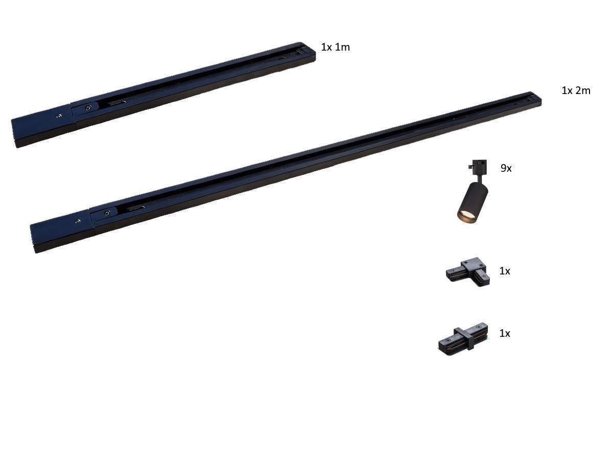 1 x 1 stuk 100cm en 1 stuk 200cm rail - materiaal aluminium - bevestiging inclusief - 220-240V - afdichting IP20 - 1 stuk door verbinder en 1 stuk L verbinding inclusief - product kleur zand zwart - 9 stuk railspots GU10 armatuur afm. Ø 55 x 102mm draaibaar 350° en kantelbaar 90° materiaal aluminum kop en kunstof basis - bulb niet inbegrepen - de rail kan eenvoudig op de gewenste lengte worden gezaagd - geschikt voor binnen - SKU 825 SKU 827 SKU 905 SKU 907 SKU 1121