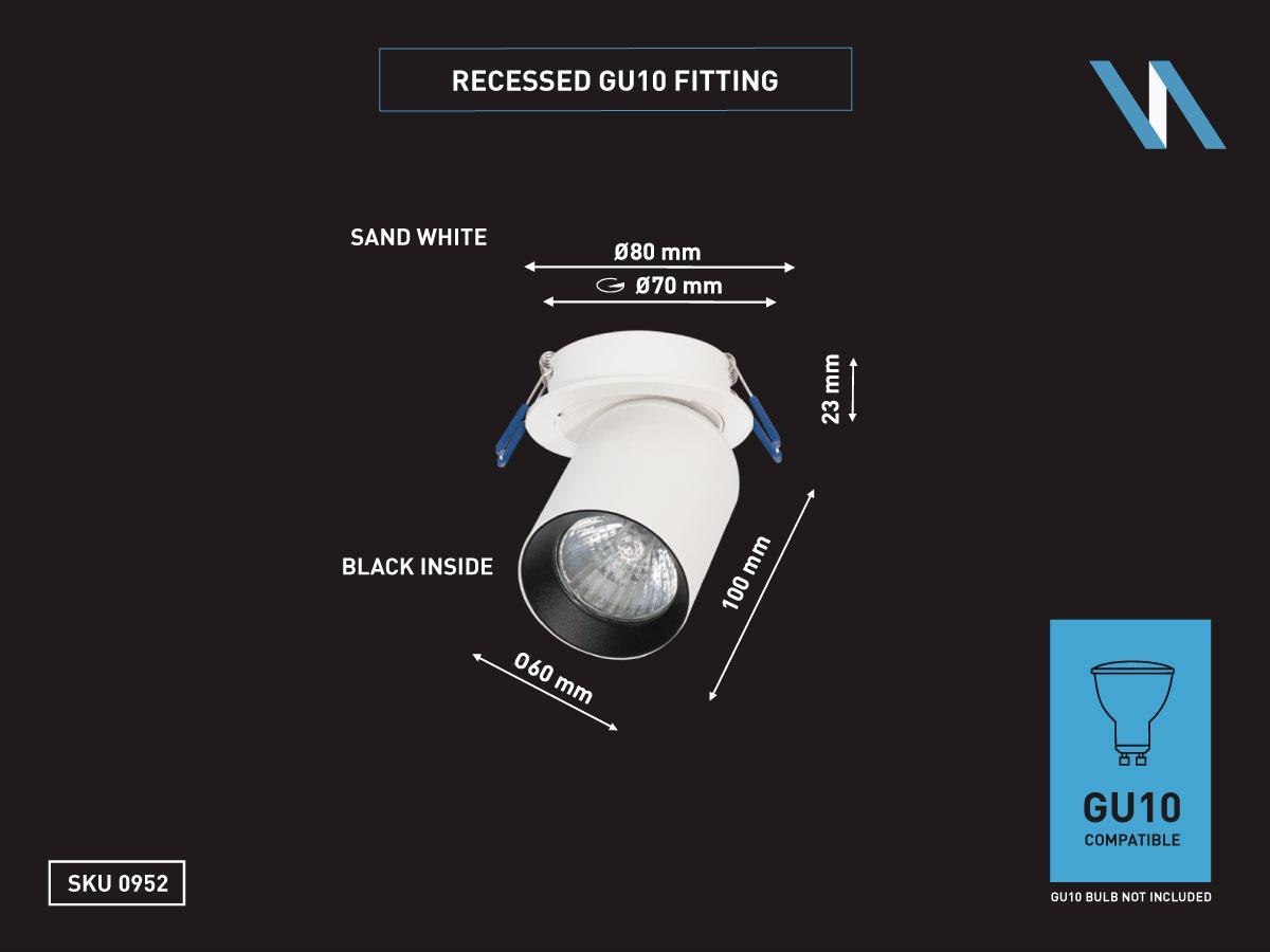 6 x GU10 Inbouwspot Armatuur cilinder zand wit en zwart draaibaar - afdichting IP20 - product kleur zand wit en zwart ring - afm. Ø 60 x 100mm - inbouwdiameter ø 70mm - draaibaar 350° en kantelbaar 50° - materiaal aluminum - bevestiging inclusief - fitting GU10 - bulb niet inbegrepen - geschikt voor binnen - een bulb invoer - voltage 220-240V - max 40 watt - SKU 00952