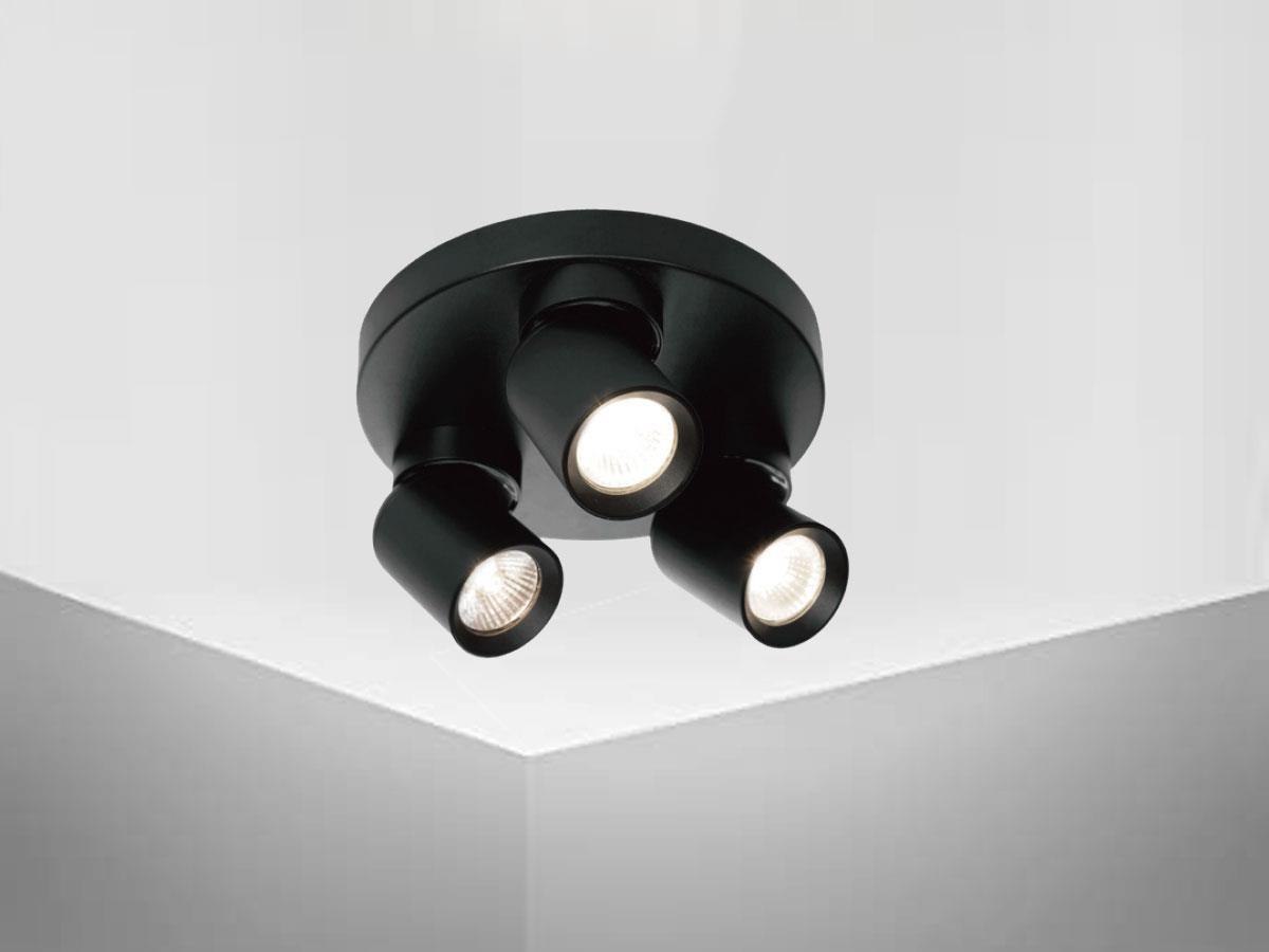 4 x Rond GU10 Opbouwspot Armatuur triple cilinder zand zwart draaibaar - afdichting IP20 - product kleur zand zwart - afm. Ø 60 x 100mm - afm wandhouder Ø 200 x 25mm - draaibaar 350° en kantelbaar 50° - materiaal aluminum en ijzer - bevestiging inclusief - fitting GU10 - bulb niet inbegrepen - geschikt voor binnen - 3 x bulb invoer - voltage 220-240V - max 40 watt - SKU 00961