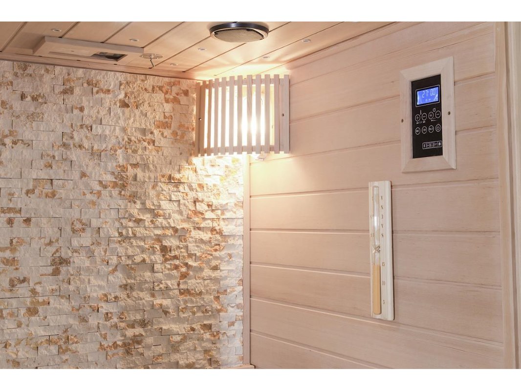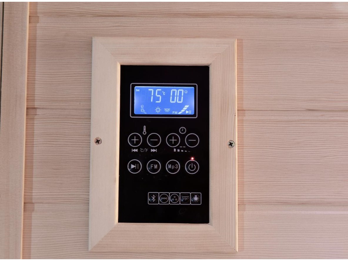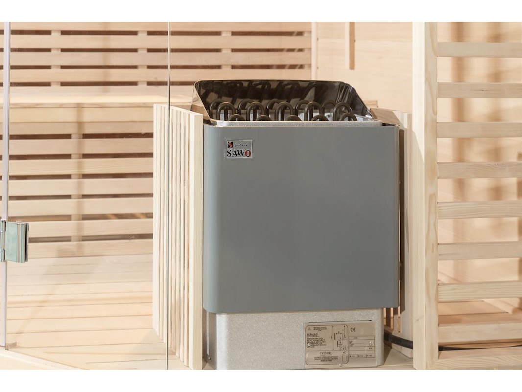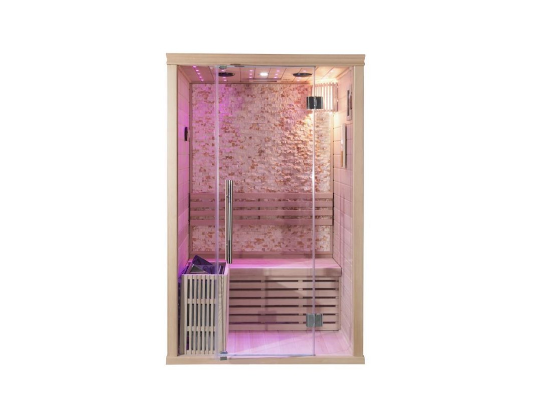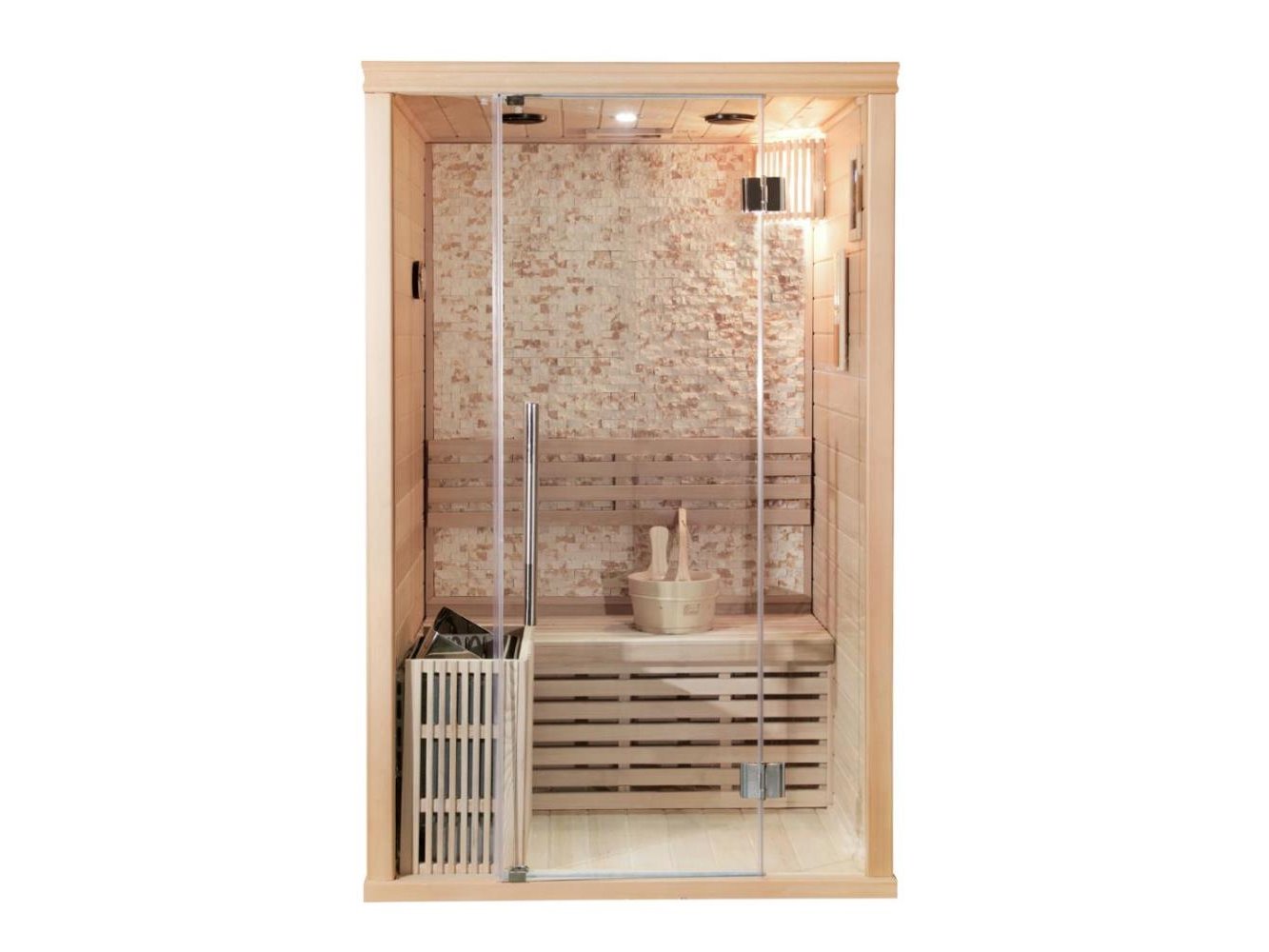 Comfort, 02, houtsoort: Canada hemlock, met led sfeer verlichting, vol glas voorkant 8 mm veiligheidsglas, rvs heater en digitaal controller, thermometer en hygrometer, glazen timer, lava steen, geschikt voor 1-2 personen, Uitsluitend samengesteld uit de beste materialen, afm: 120x105x190cm (l x b x h). Nieuw
