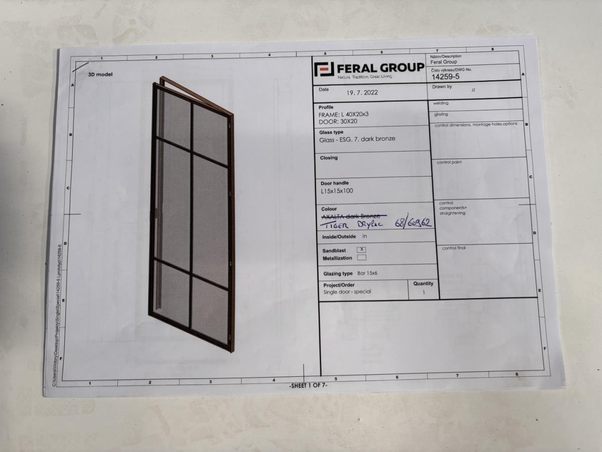 Authentiek gemaakte stalen binnendeur met 6 verdelingen. Afmetingen Breedte: 902 mm x Hoogte 2509 mm Opgebouwd uit kokerprofielen aanzicht 15mm - verdelingen afgewerkt met 15 x 5 glaslatten - massieve greep tussen de verdelingen - veiligheidsbeglazing DARK Bronze - gepoederlakt TIGER bronskleur - adviesprijs € 2250