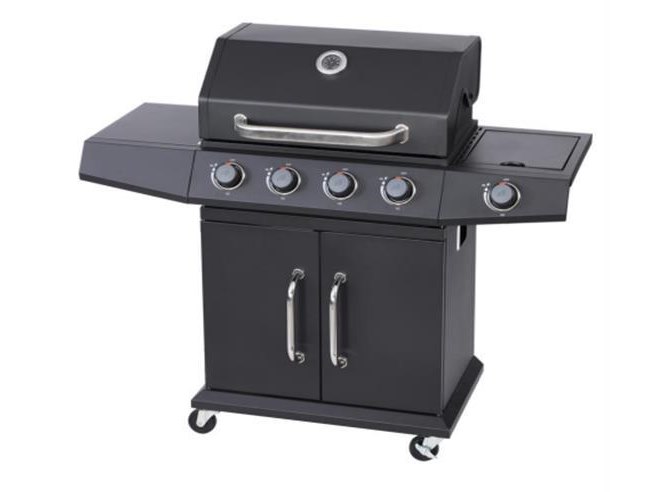 Gas BBQ, cooking area : 615 x 375 mm, steel with black powder coating, 2,8 kw per mainburner, 2,5 kw per side burner, 120 x48x110 cm