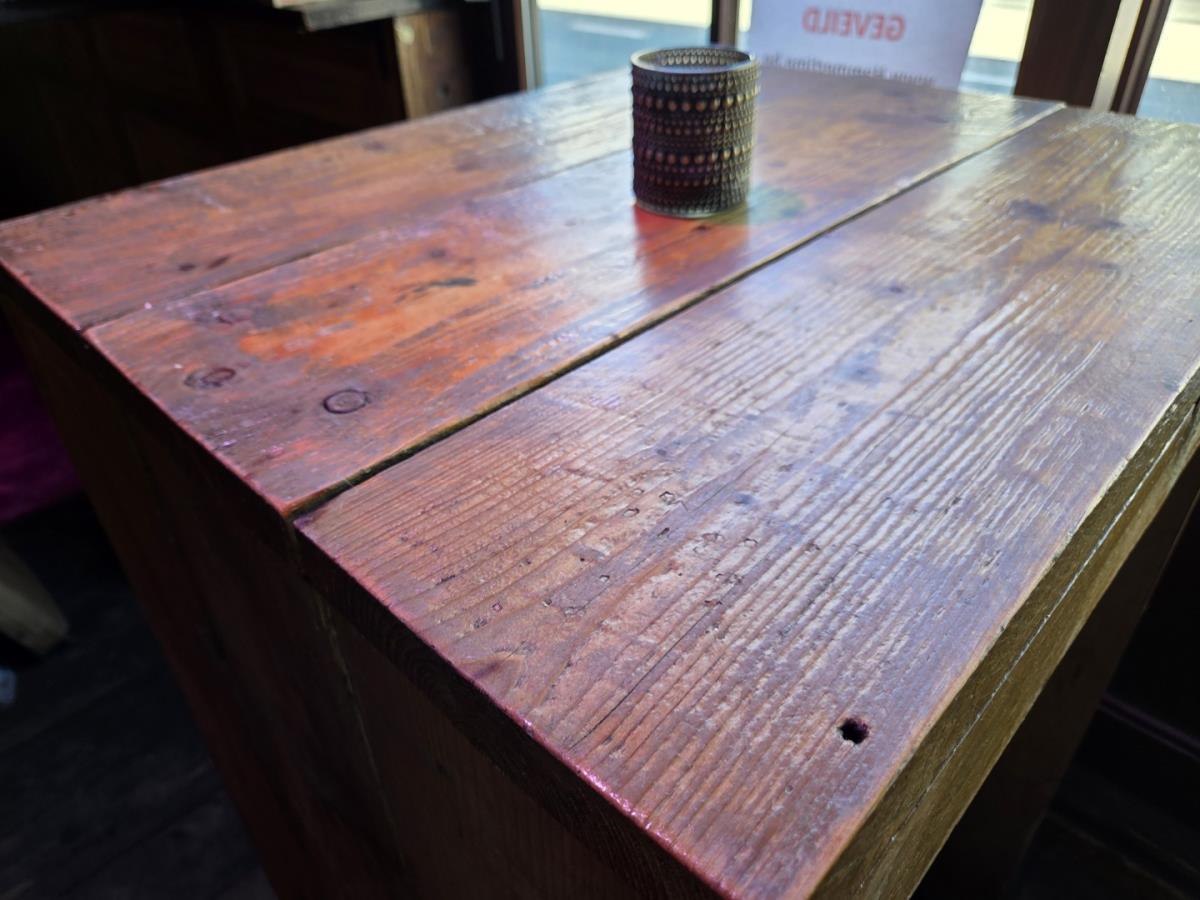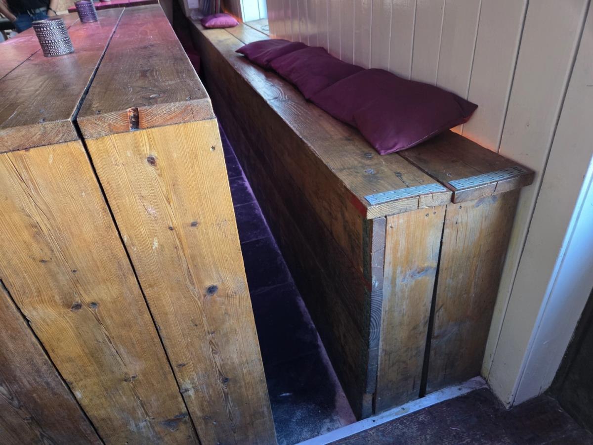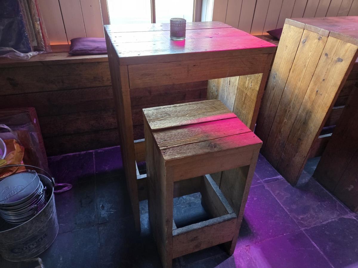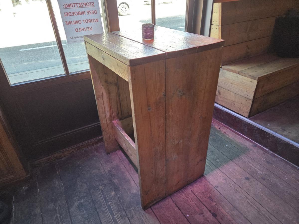 Bu 1 lange wandbank (plm 5 LM) , 3 diverse tafels (2 x 1 meter + 1 x 2 meter) incl 4 houten krukken, Koper dient wandbank zelf te demonteren, LET OP!!! Breng hulp mee want is zware kwaliteit!