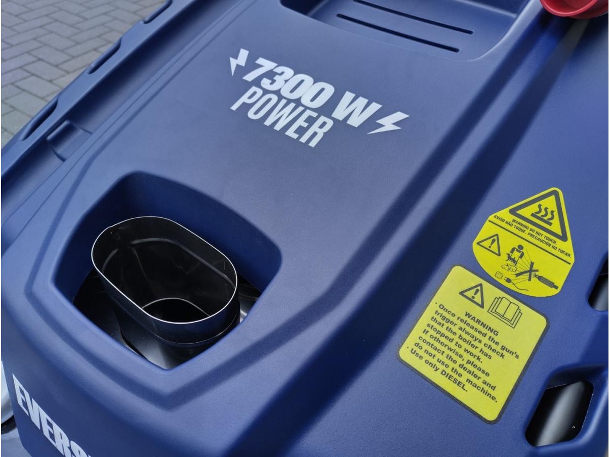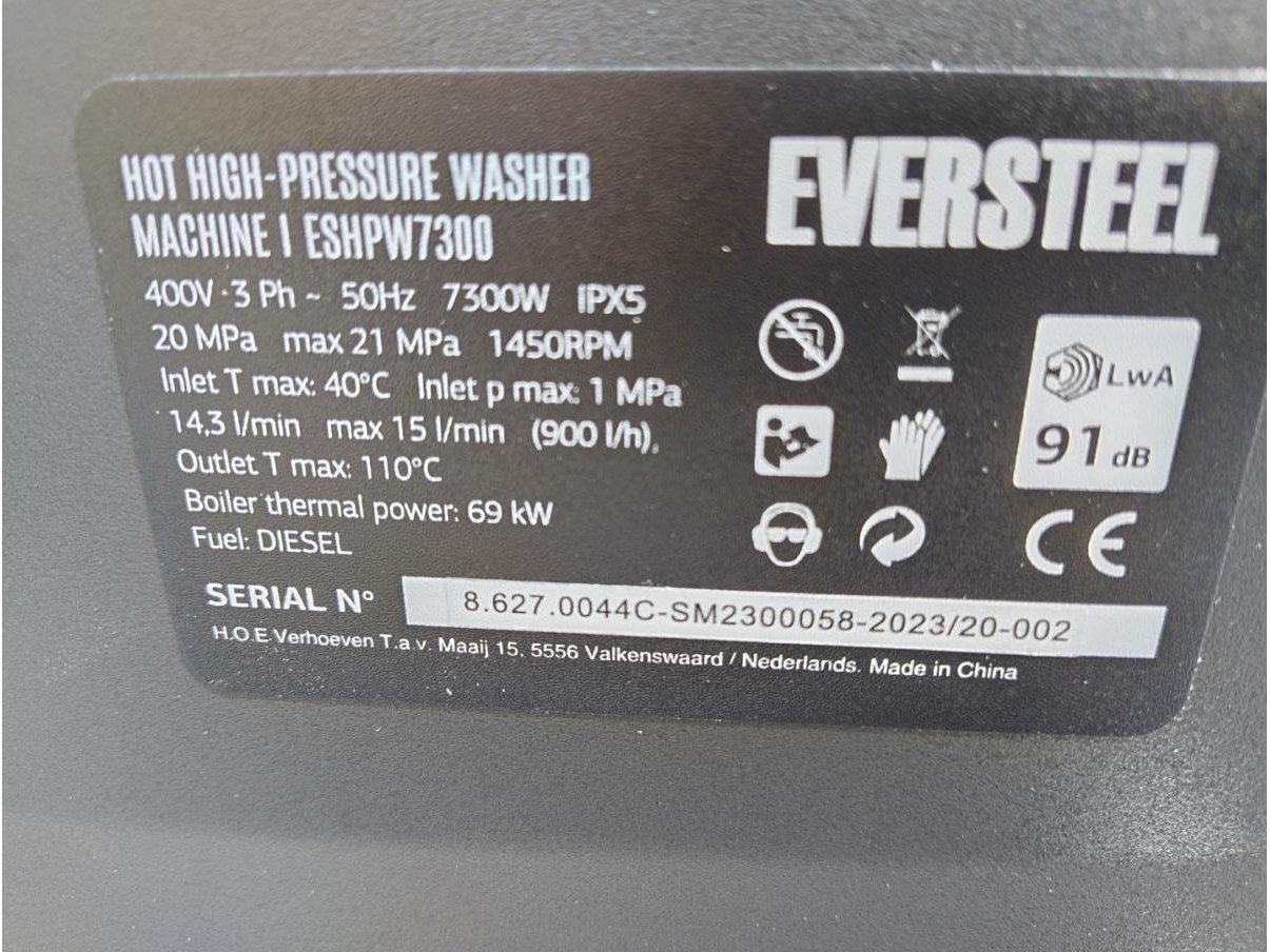 Diesel hogedruk stoomreiniger professioneel, incl. 10 meter hogedrukslang en spuitlans, vloeistof aanzuiging voor reinigingsproducten, waterfilter, dieseltank voor verwarming 10 liter inhoud, 2 zwenkwielen en 2x vaste wielen, 5 polig 16 Amp industriestekker 380 volt, 7300 watt, 69 KW verwarming vermogen. tot 110 graden. nieuw in krat