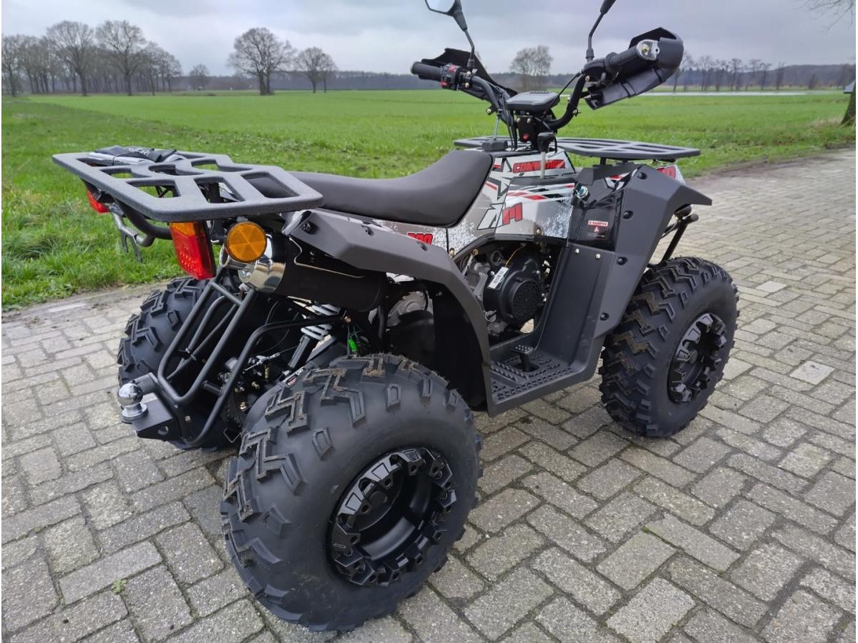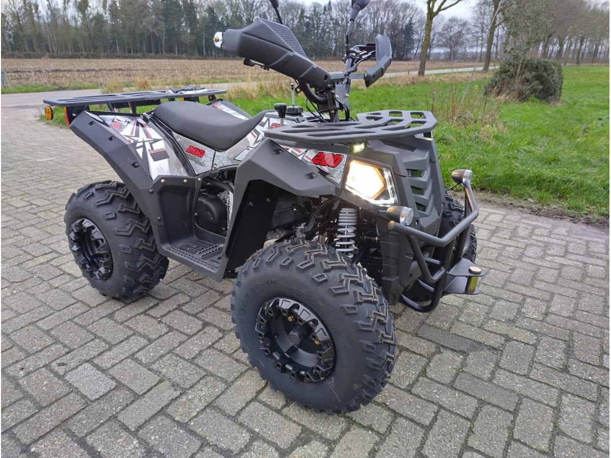 Ongebruikt AIII Commander 200CC Quad, COC aanwezig, geschikt voor openbare weg, Motortype: 200 CC, FNR, CVT, eencilinder, oliekoeling. Carburateur: PD24. Rijden: #530 kettingaandrijving. Ontsteking: Elektrische start. Maximum snelheid: 60 km/h. Tankinhoud: 6L/Staal. FR&RR Wielen: Fr: Stalen velg: 23×7-10" Rr: Stalen velg: 22×10-10" off-road banden. Snelheidsmeter: LCD-scherm. Schokdempers: hydraulische schokdempers. Rem: Fr &; Rr schijfrem. Stuur/Frame: Staal. Achterbrug: staal. in doos geleverd