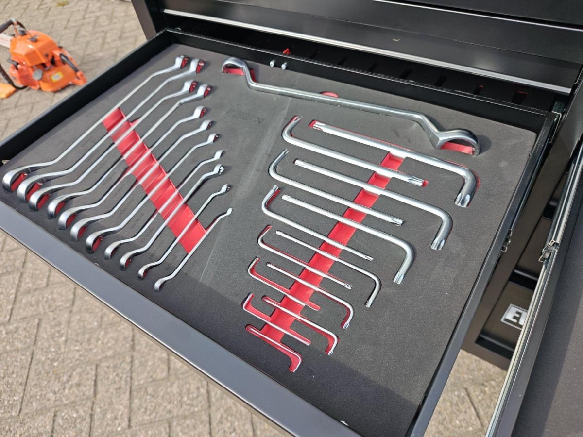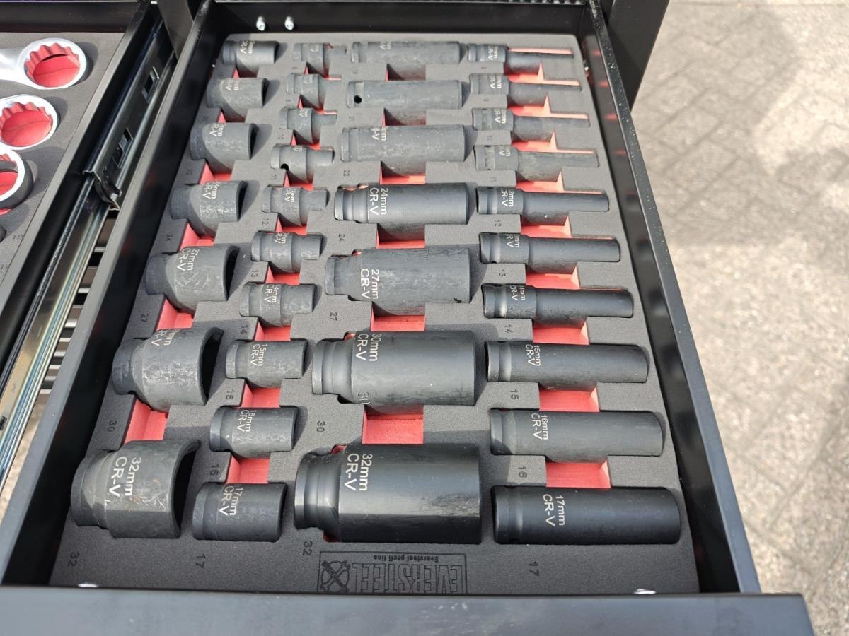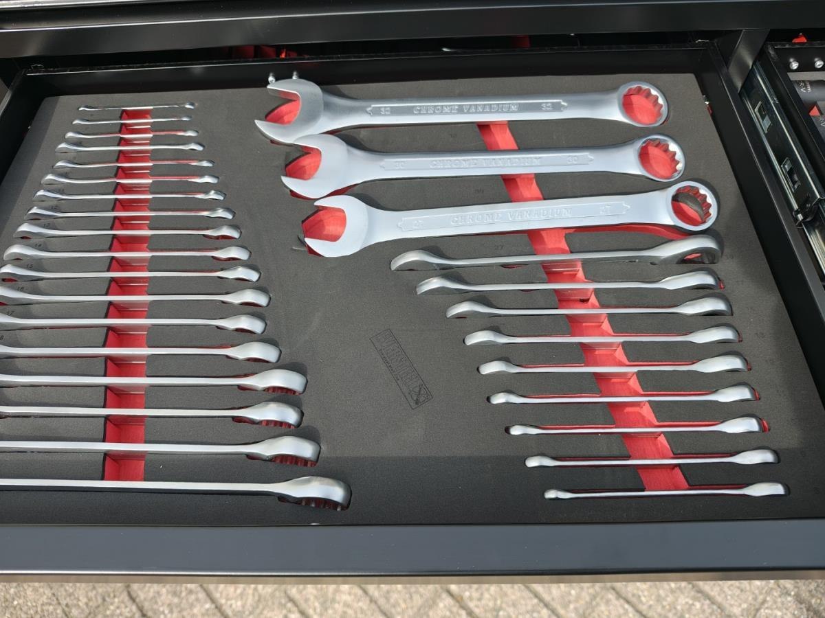 Compleet gevuld met gereedschap, t/m sleutel 34, en met krachtdoppenset ongebruikt