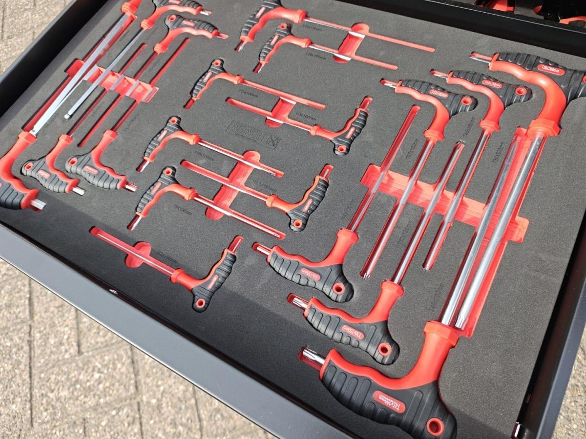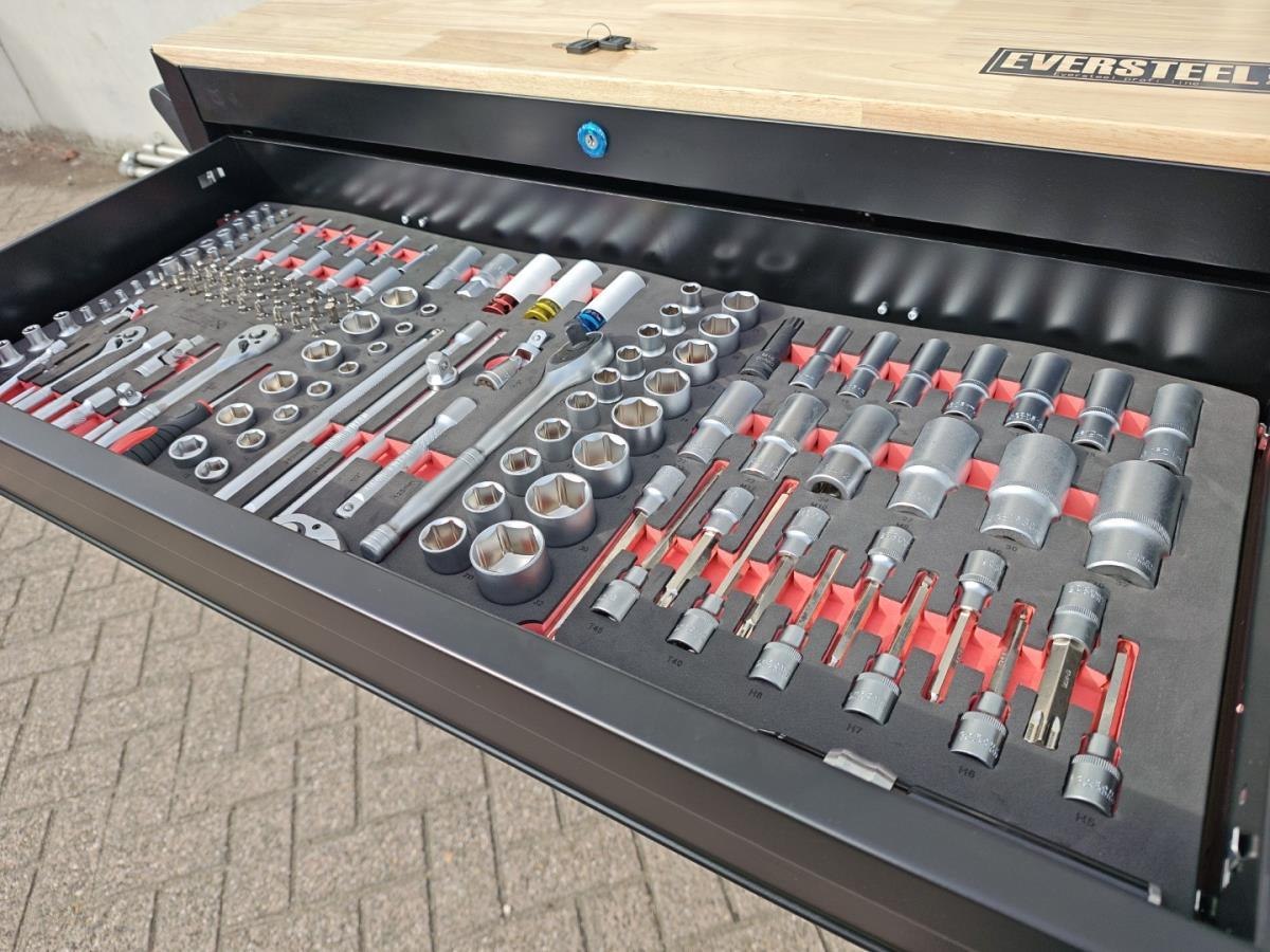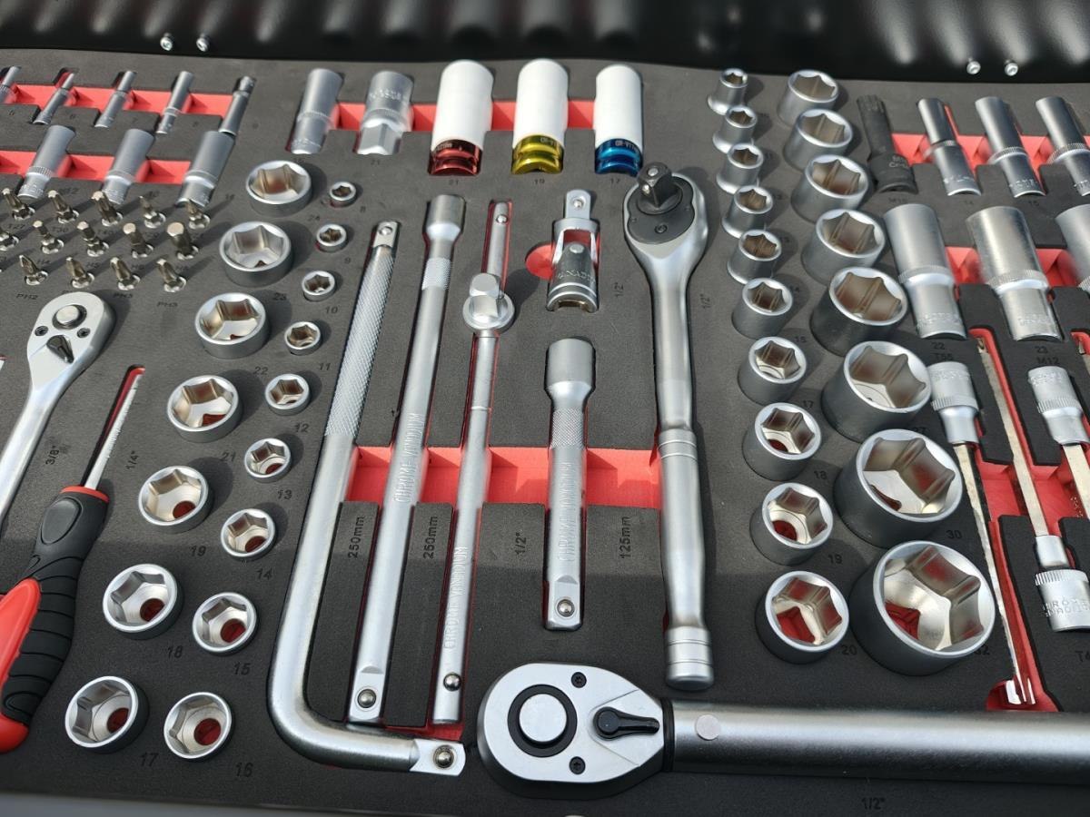 Compleet gevuld met gereedschap, t/m sleutel 34, en met krachtdoppenset ongebruikt
