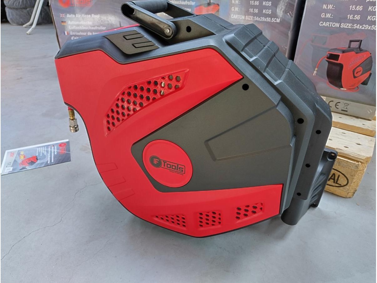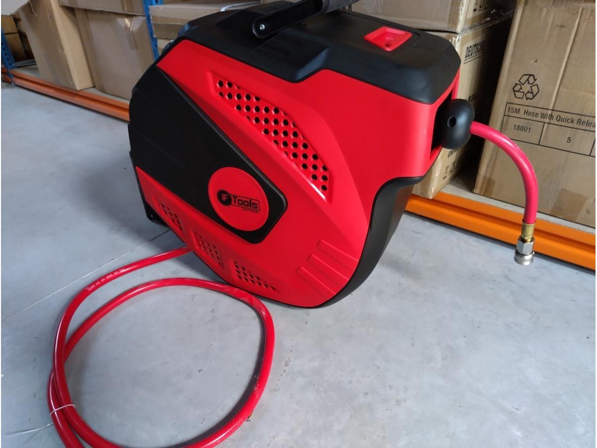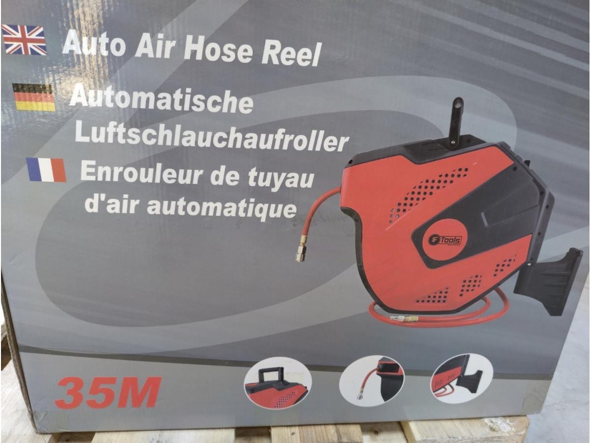 Automatische luchtslanghaspel 35 meter, met auto afslag, koppelingen en muursteun. Nieuw in doos