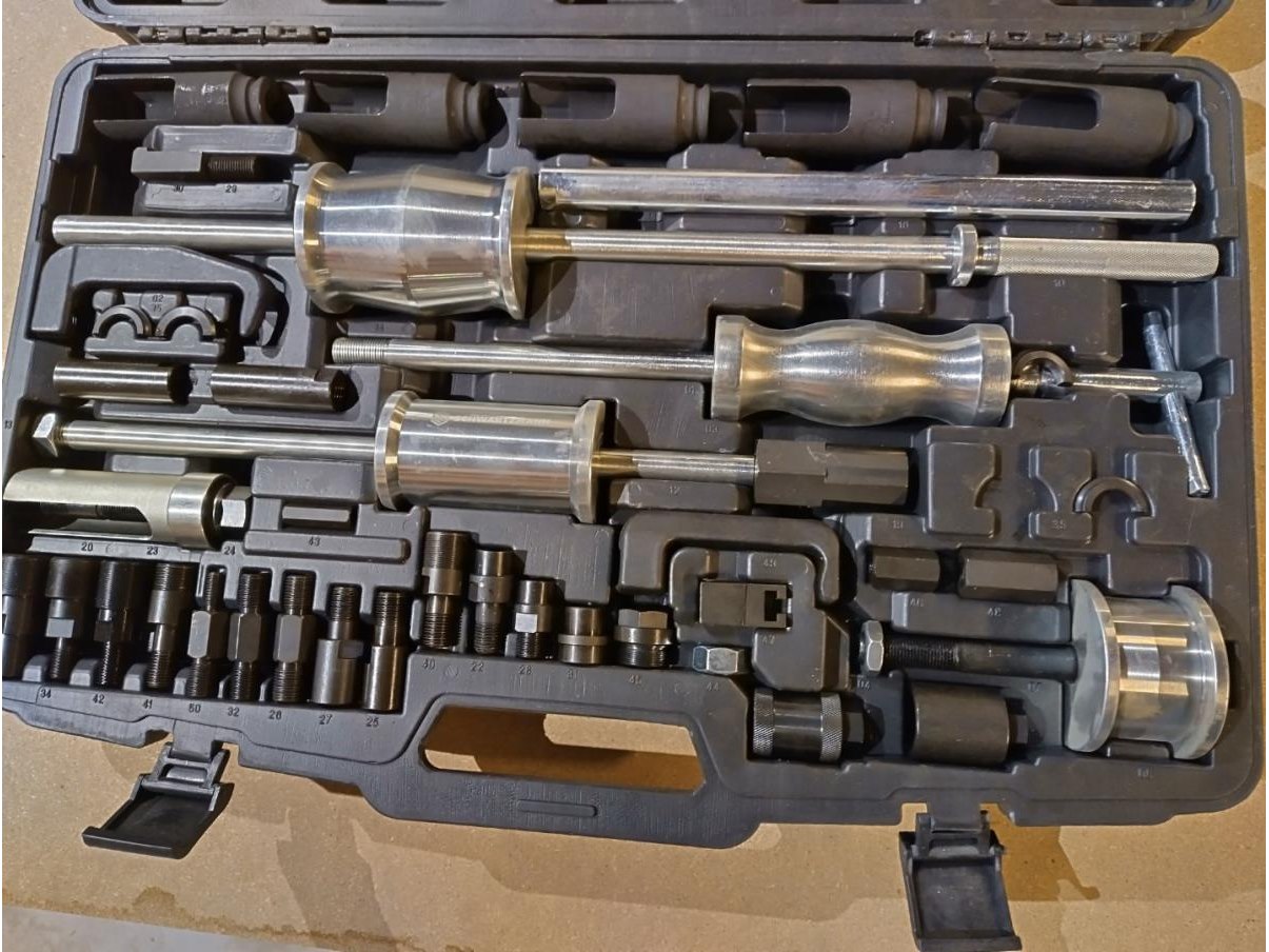 3x slangtrekker: 1.6kg/160mm, 2.7kg/460mm, 5.1/600mm, Trekvorken met openingen: 13.7x18mm, 105mm lang, 12.7x19mm, 130mm lang. Slotted 1/2" Drive sockets, 6 pt, 100mm long. 25/27/28/29/30mm, -Sleeve design injector extractor with supporting shells, outer diameter 35mm internal diameter 29mm, M17x1.0 spindle, -Pulling adapter with external thread M27x1.0(3pcs) and M25x1.0 -Pulling adapter with internal thread M27x1.0(3pcs), Sliding hammer adapter for inner, outer and claw extractor