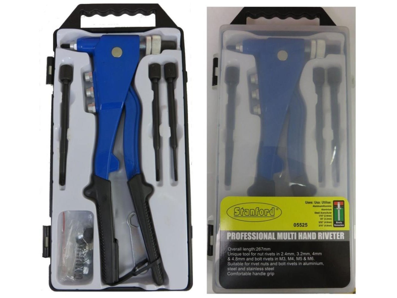 Popnageltang, 265 mm, Voor moerklinknagels 2.4 - 3.2 - 4 - 4.8 en boutklinknagels M3 - M4 - M5 en M6, Extra omschrijving (1 x geschikt voor inwendig en 1 x geschikt voor uitwendig gebruik). Voorzien van geisoleerde grepen