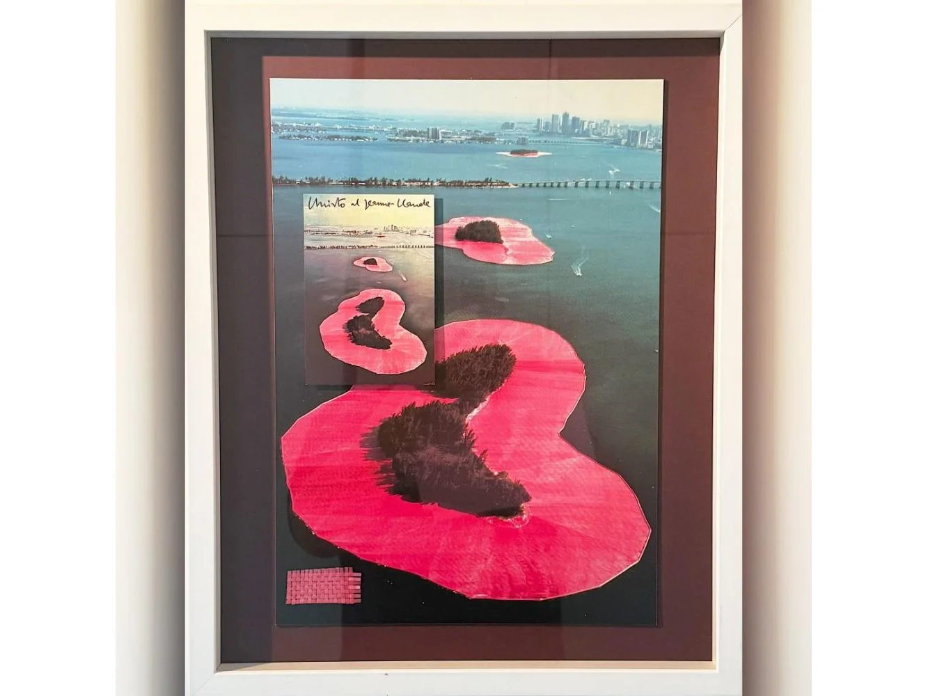 Collage, gesigneerd, professioneel ingelijst, 53 x 43 cm + persbericht op roos papier + origineel stukje stof, galerieprijs 2.500 €